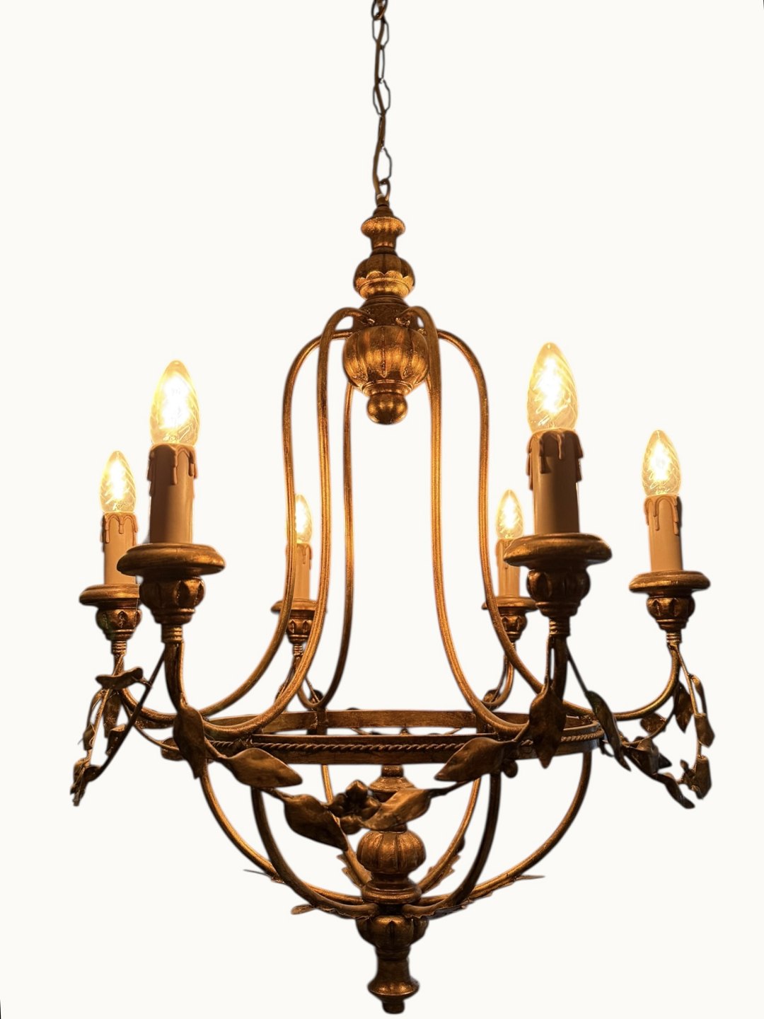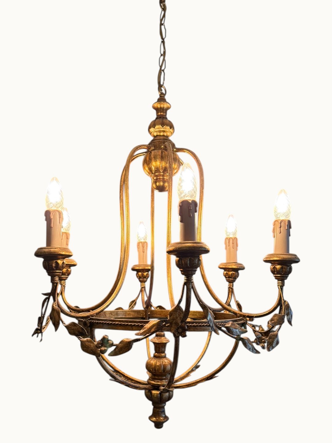 Beskrivelse: Burformet metal og træ lysekrone til elektricitet i Louis XVI stil, diameter ca. 60cm *fin og funktionsdygtig stand*