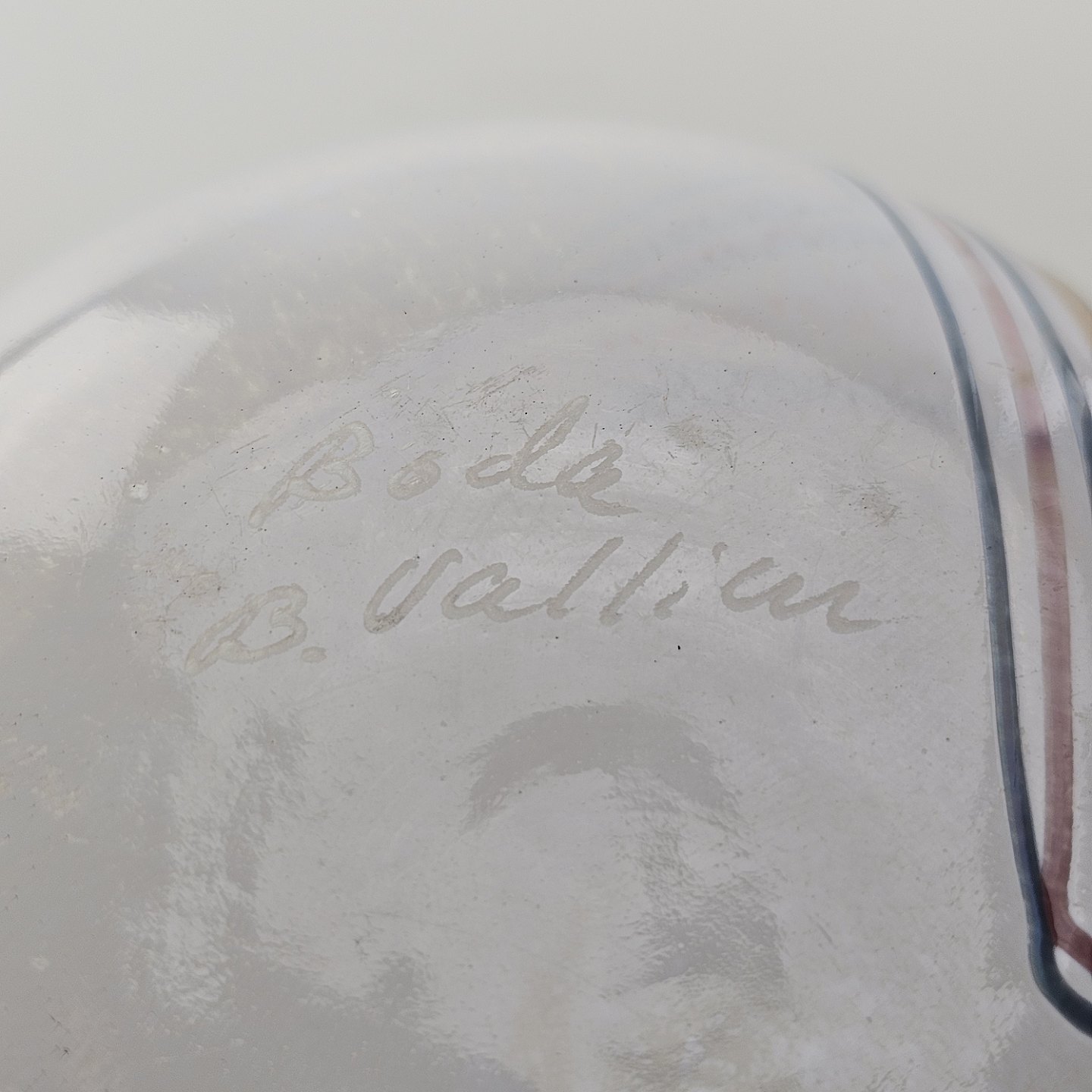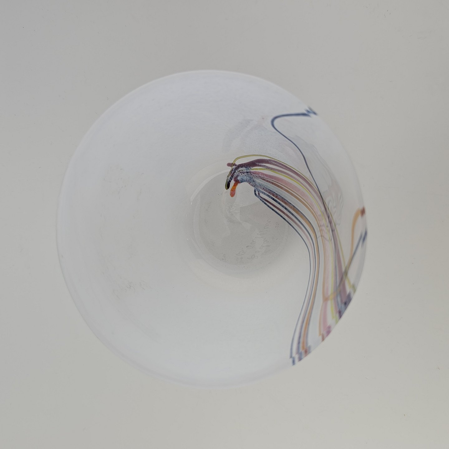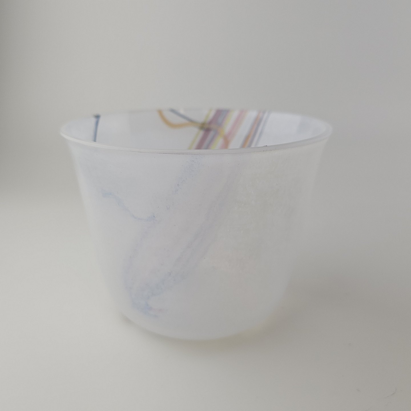Beskrivelse: Skål i glas med abstrakt dekoration i flere farver