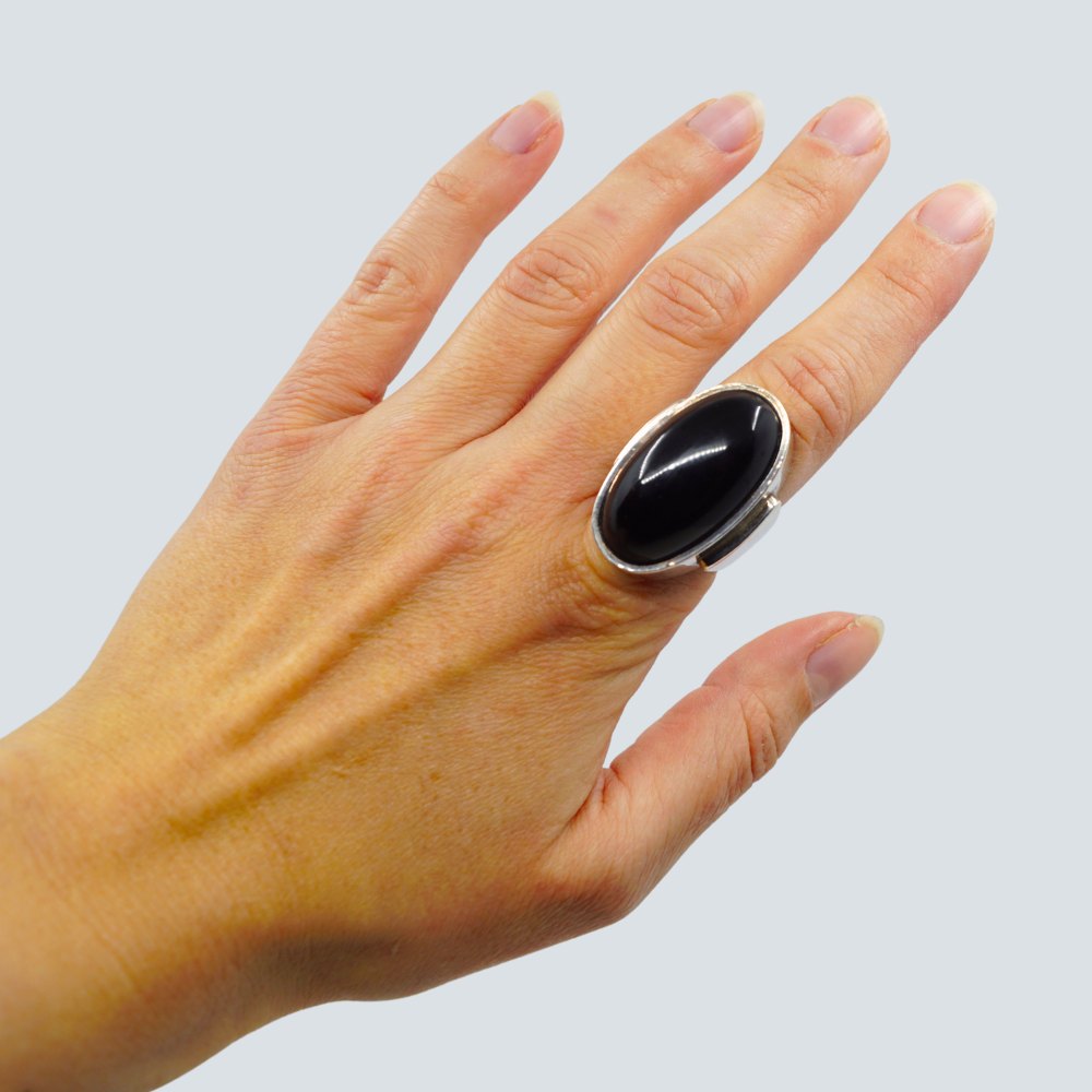 Beskrivelse: Georg Jensen; Ring af sterling sølv prydet med stor oval onyx.