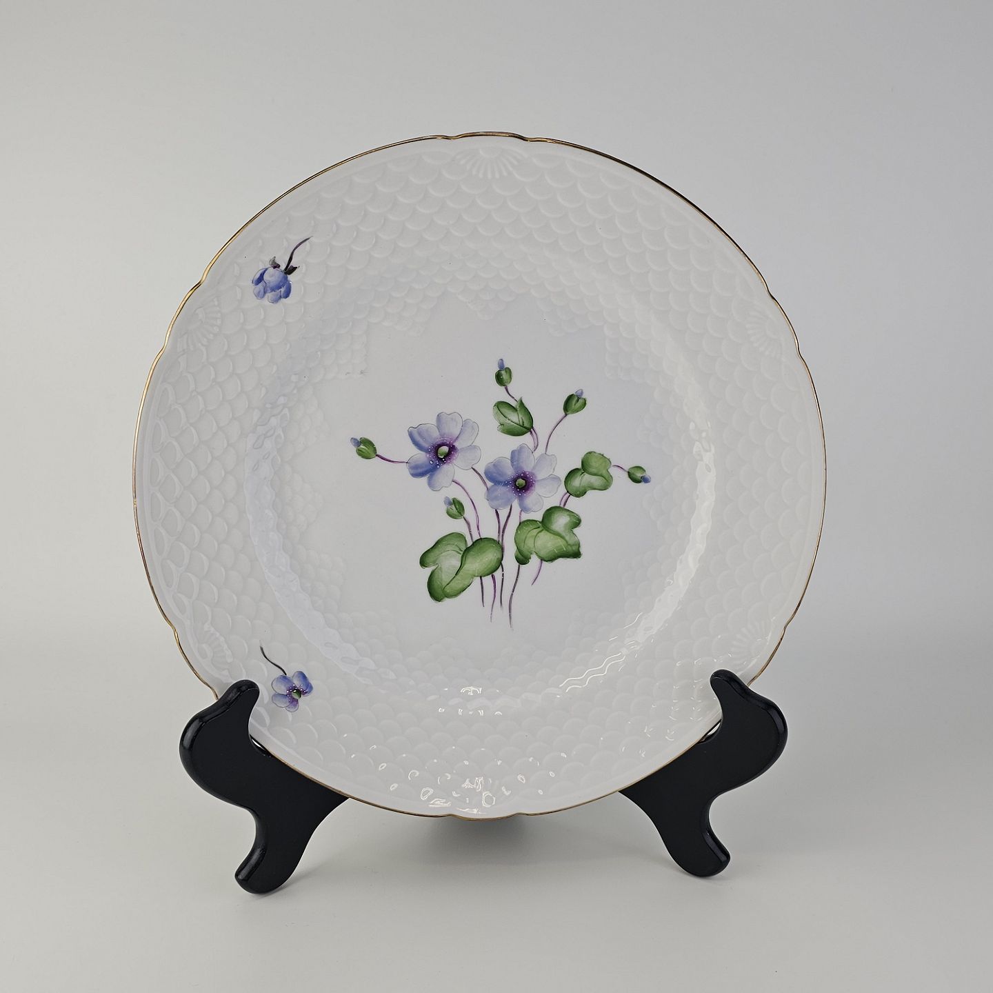 Antonius er af hvidt porcelæn med skælform dekoreret med håndmalede blå anemoner og guldkant. Også kendt under navnet Blå Anemone.