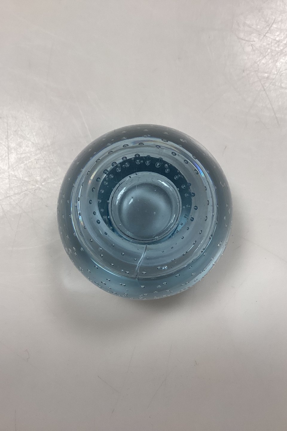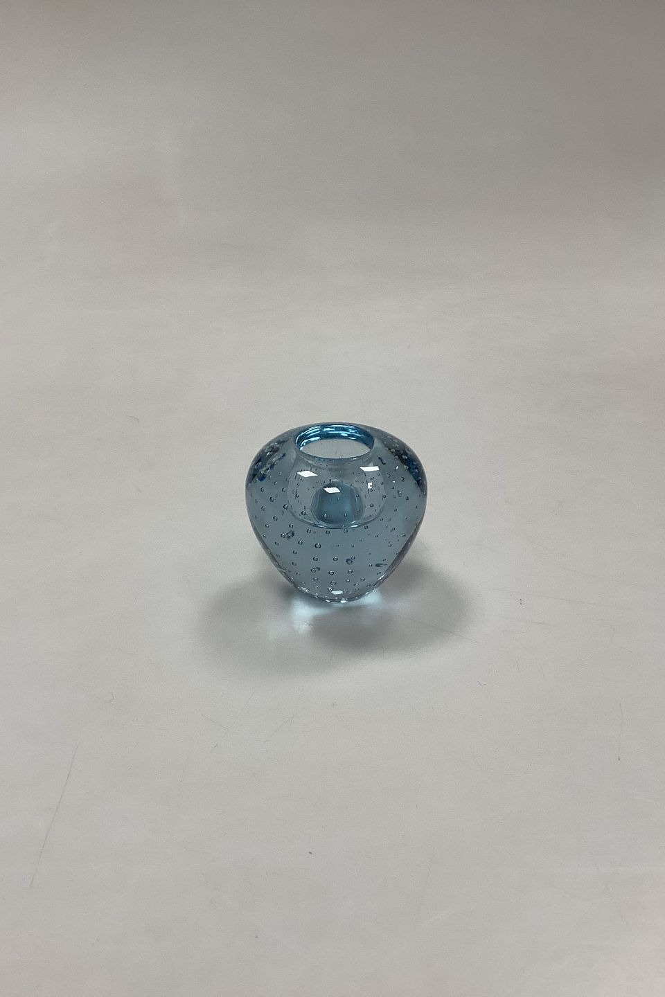 Beskrivelse: Lille Glaslysestage med bobler. Sandsynligvis skandinavisk fra 1950´erne. Farve: Lyseblå. Små ridser og en støbningsrevne på siden.