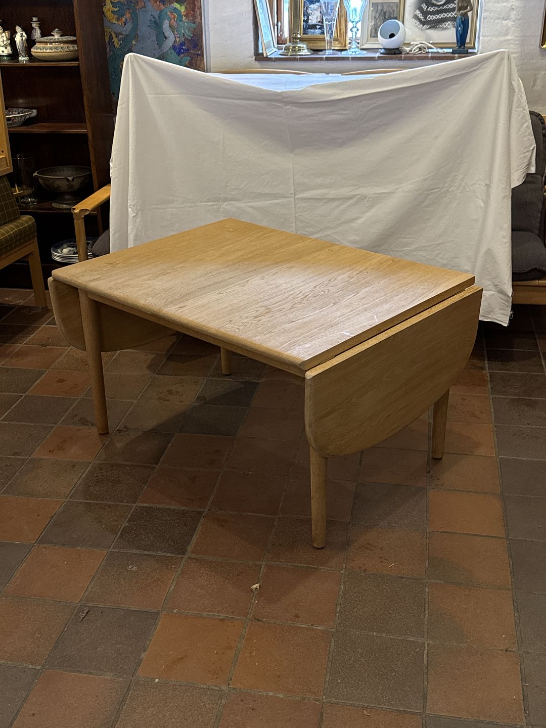 Beskrivelse: Hans J. Wegner sofabord m. Klapper model GE85 udført i massiv sæbehandlet egetræ. Fremstillet hos Getama i 1990’erne.