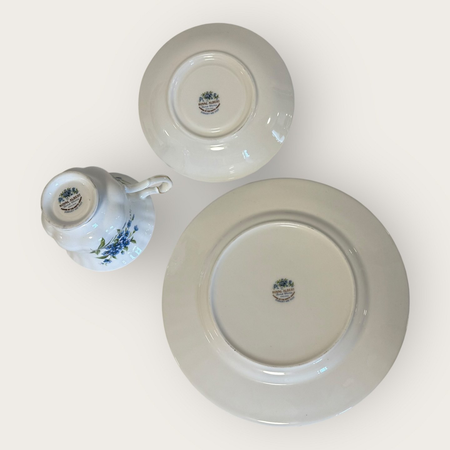 Beskrivelse: Royal Albert, Flower of the month, Trio sæt med kop, underkop og kagetallerken, tallerken har diameter 20,5cm, koppen har diameter 9cm og højde 7cm *Fremstår i perfekt stand*