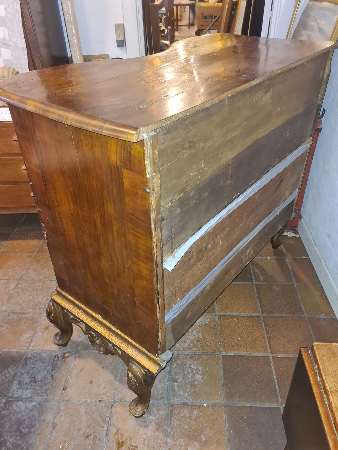 Beskrivelse: Rokoko dragkiste udført i delvis fineret mahogni og nøddetræ.