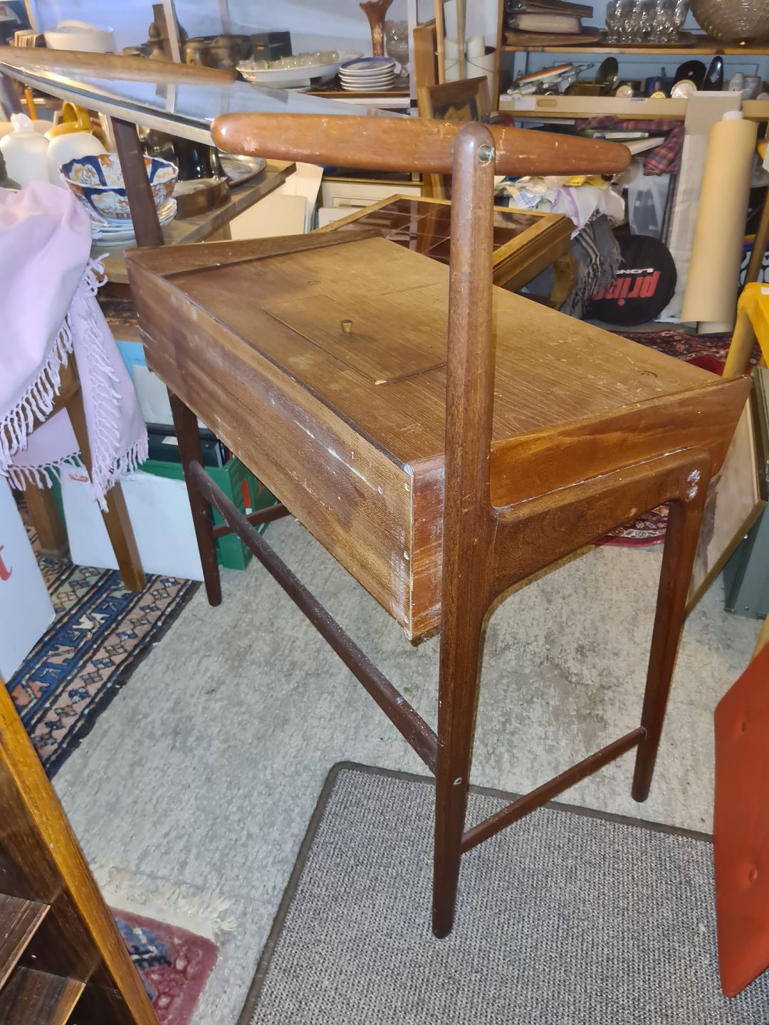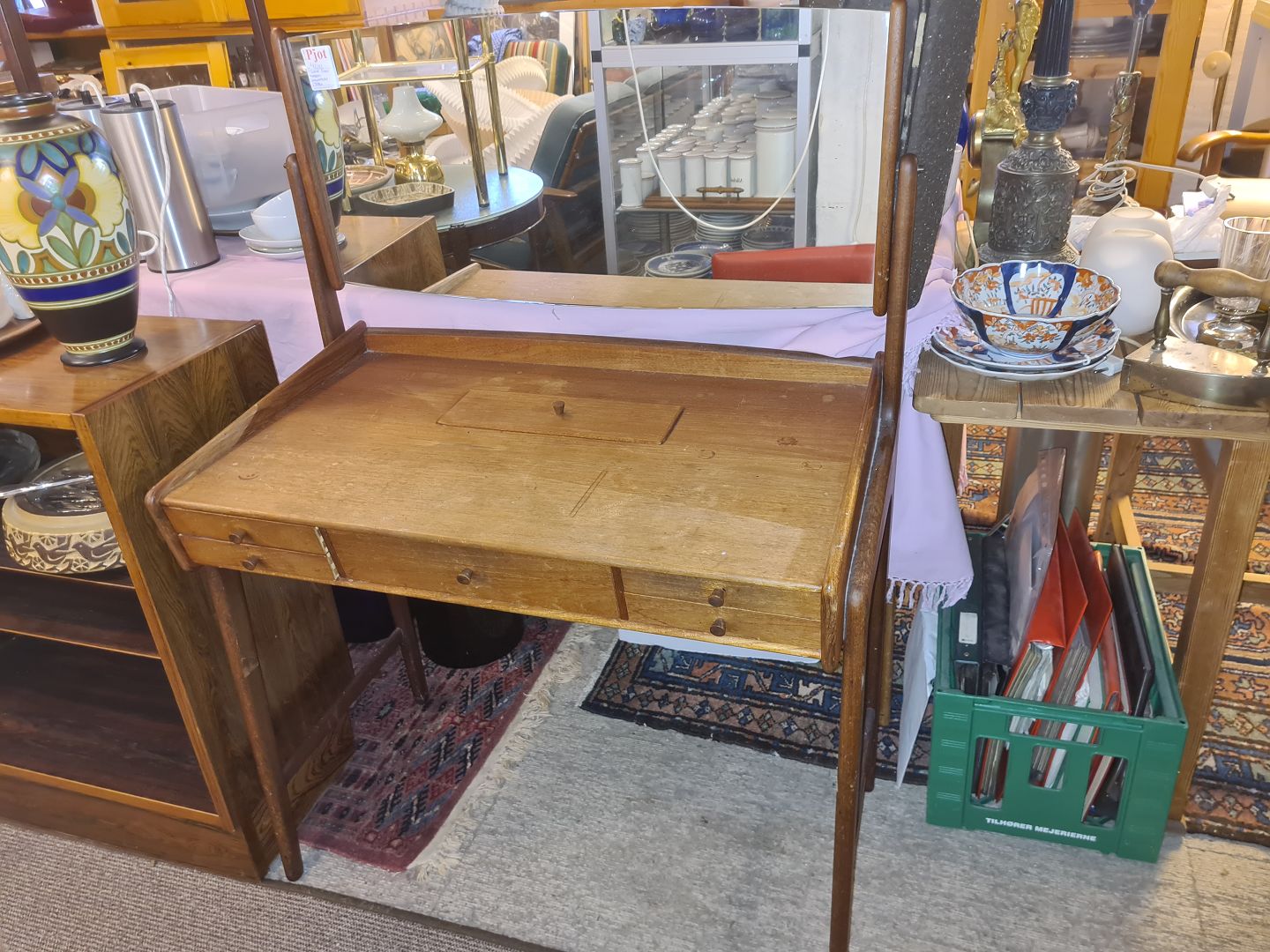 Beskrivelse: Svend Aage Madsen sminkebord i teak m. spejl med vippe funktion.