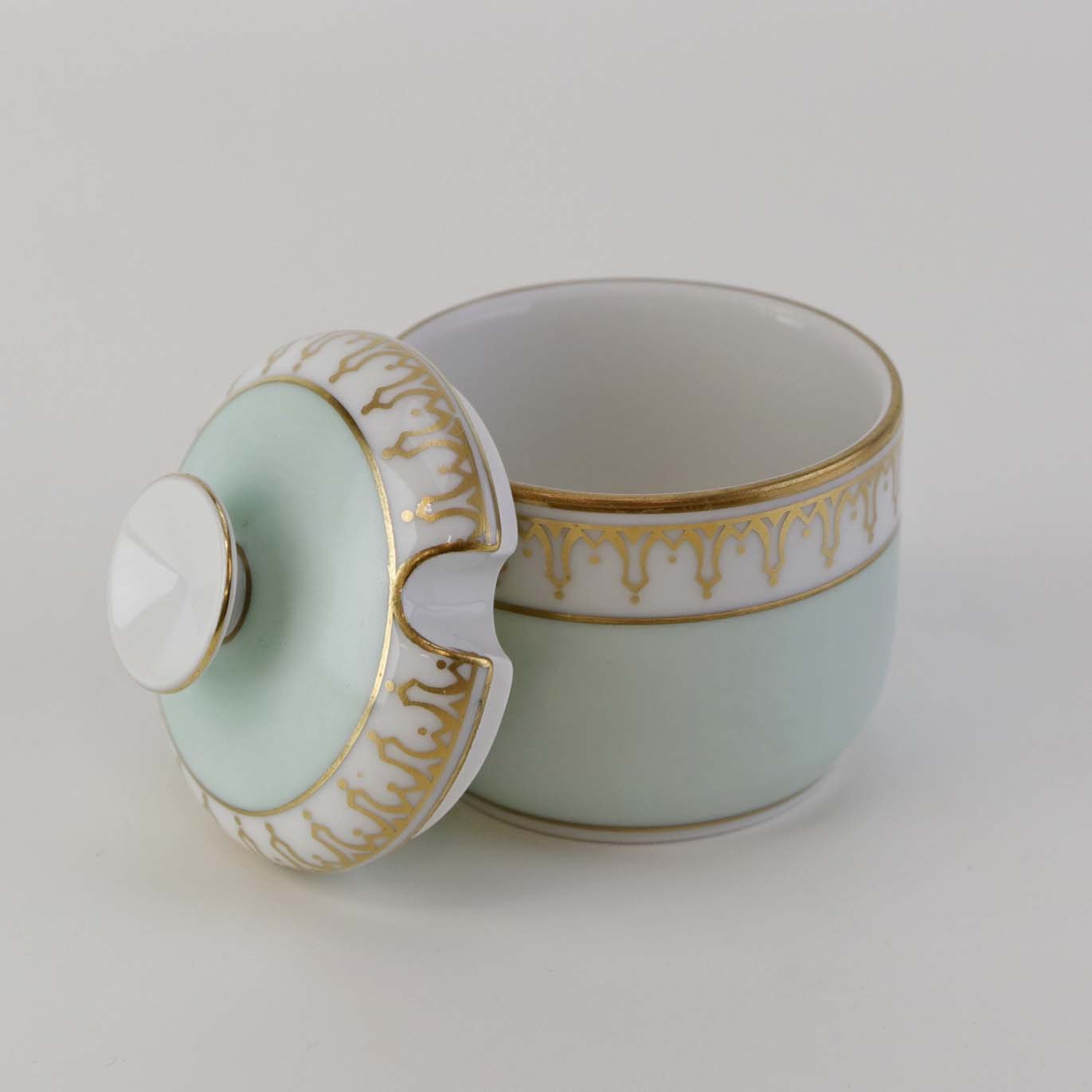 Thorvaldsen er stel i glat hvidt porcelæn med lysegrøn bort, forgyldt dekoration og guldkant