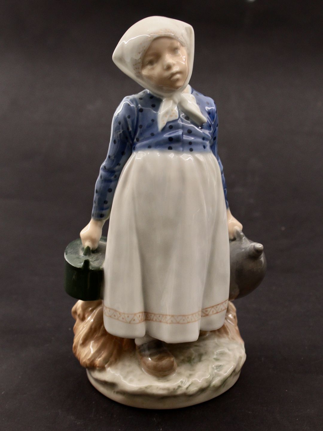 Description: Royal Copenhagen, Farm Girl 815 with lunch, jug and pan. Designed by Christian Thomsen. H. 21.5 cm. item no. 631518