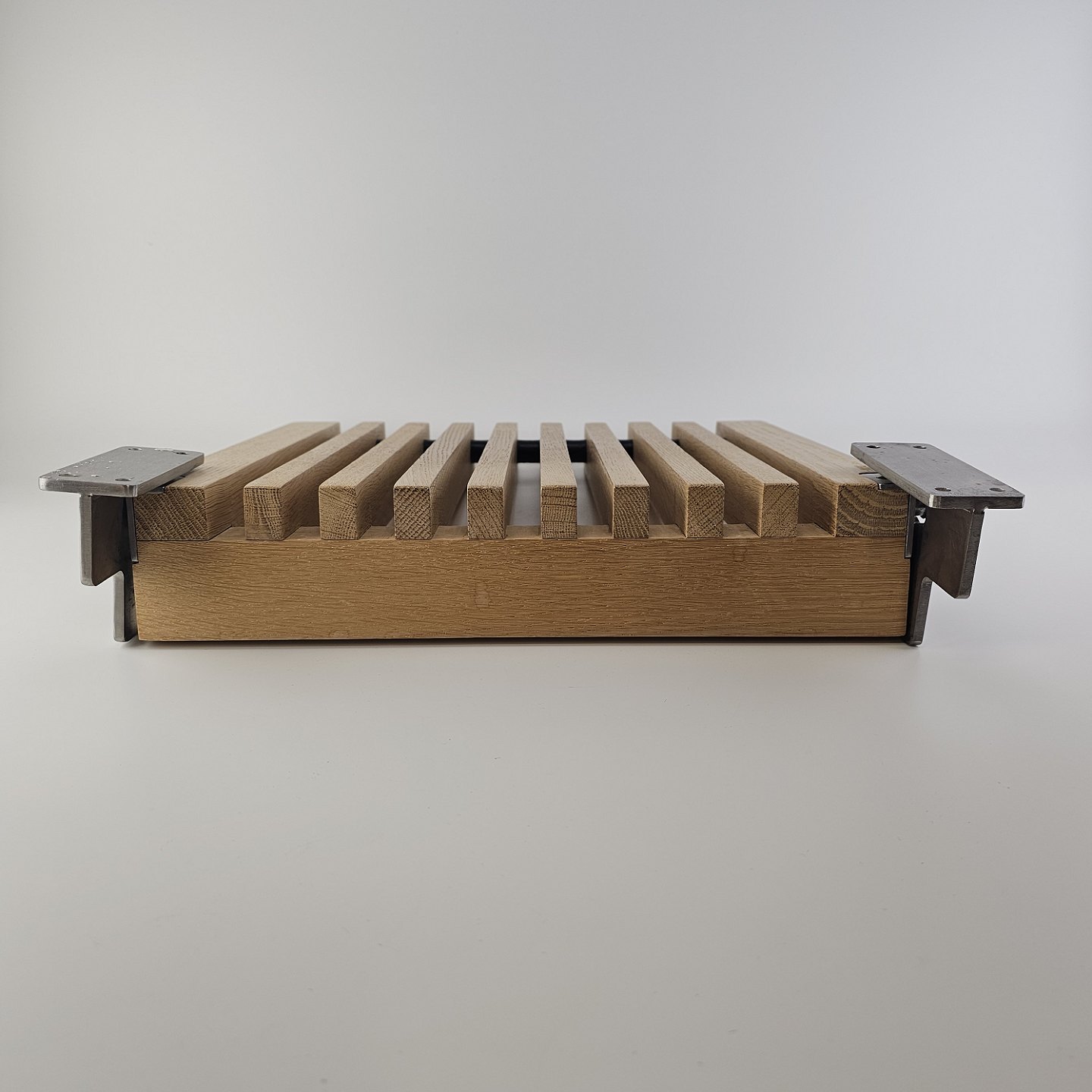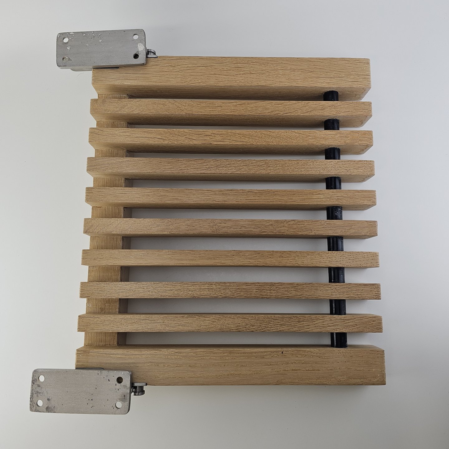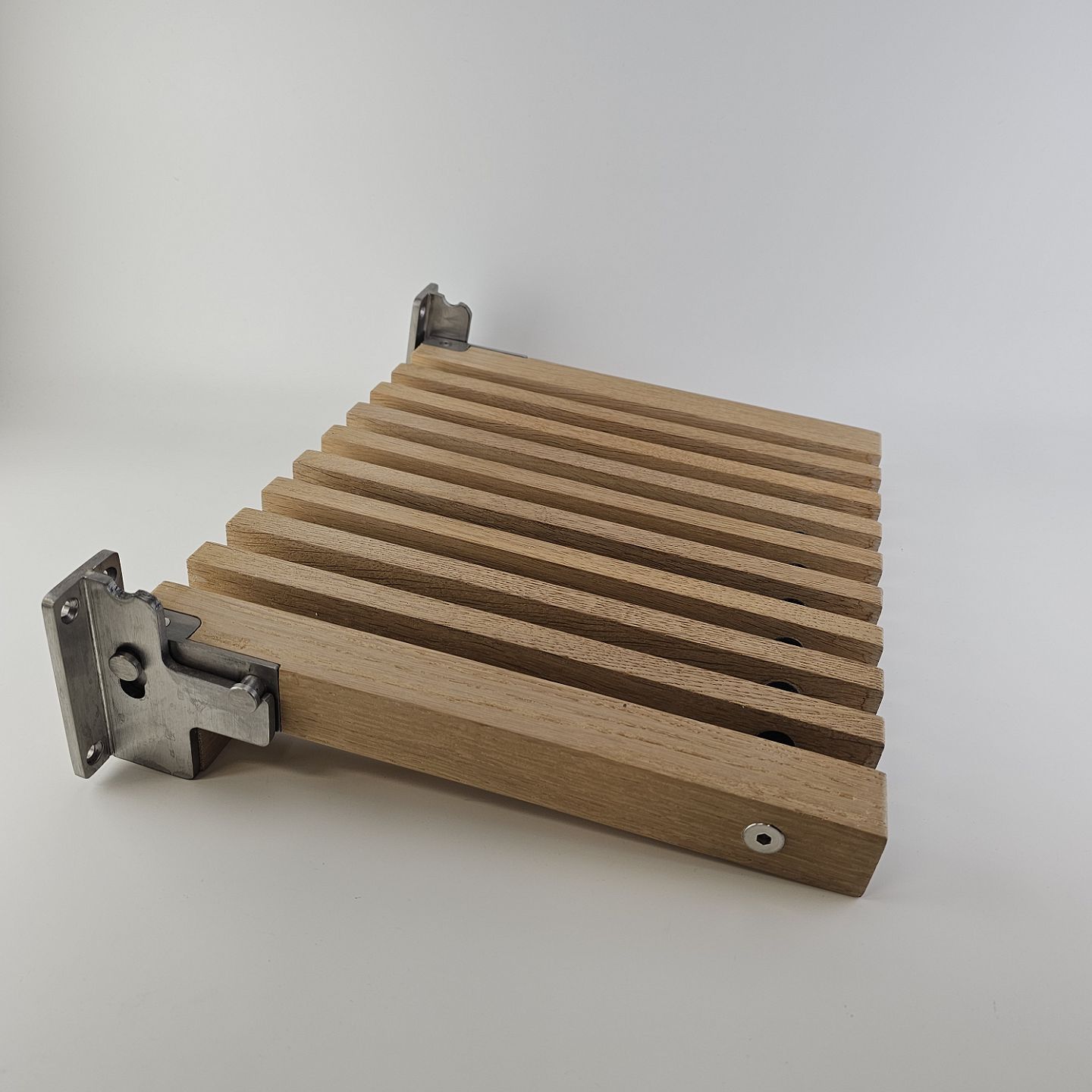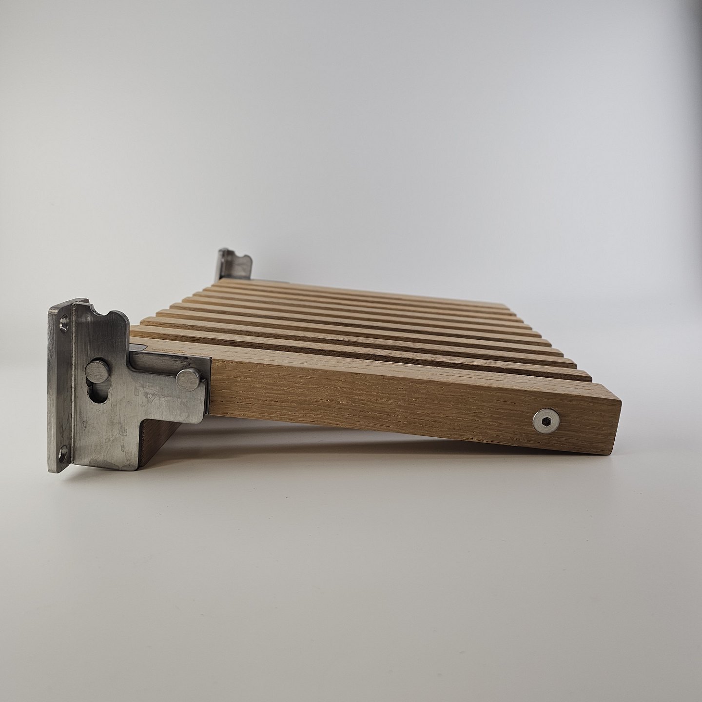 : Klapsæde i eg med beslag til vægophæng