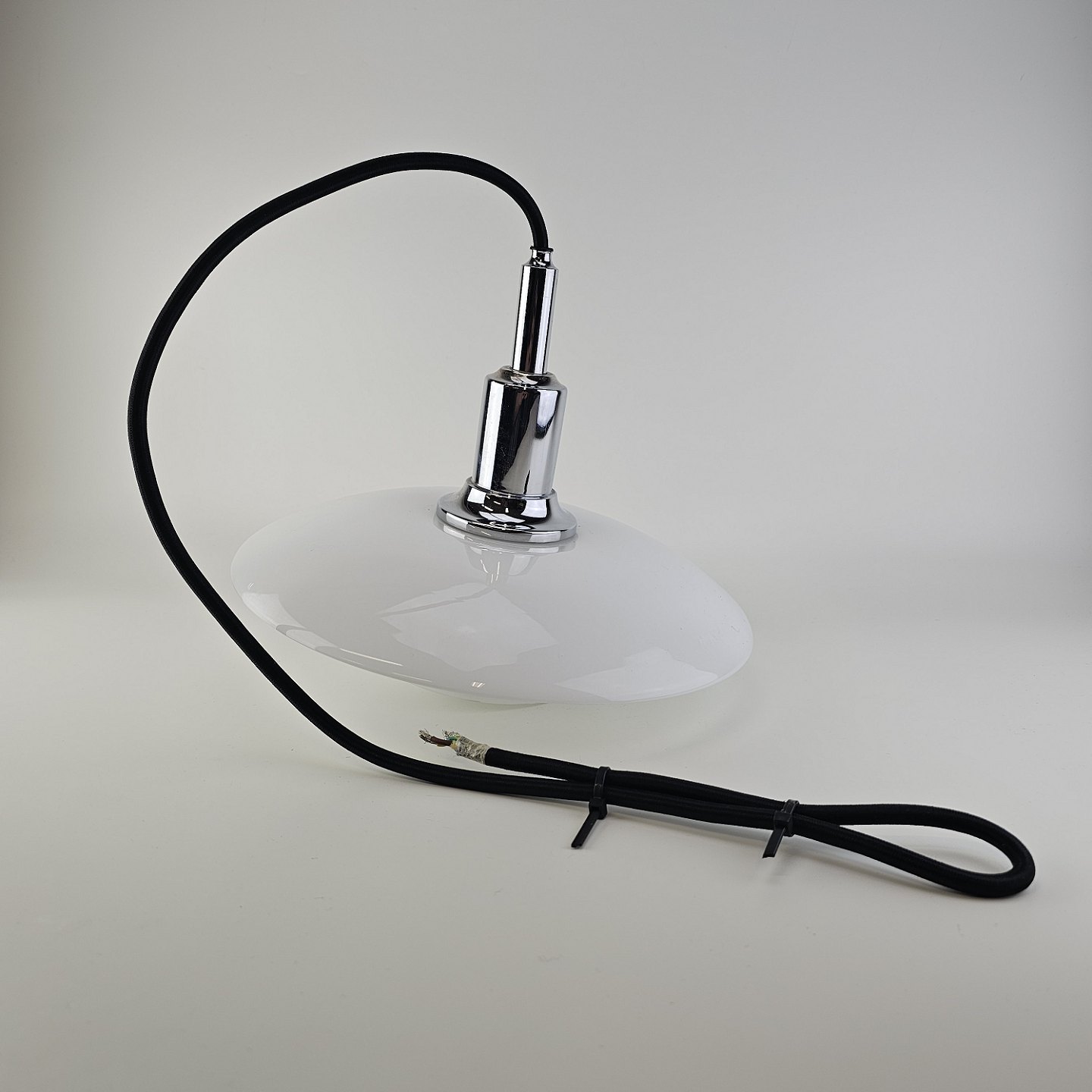 Beskrivelse: Loftlampe i hvidt opal glas med fatning i forkromet metal