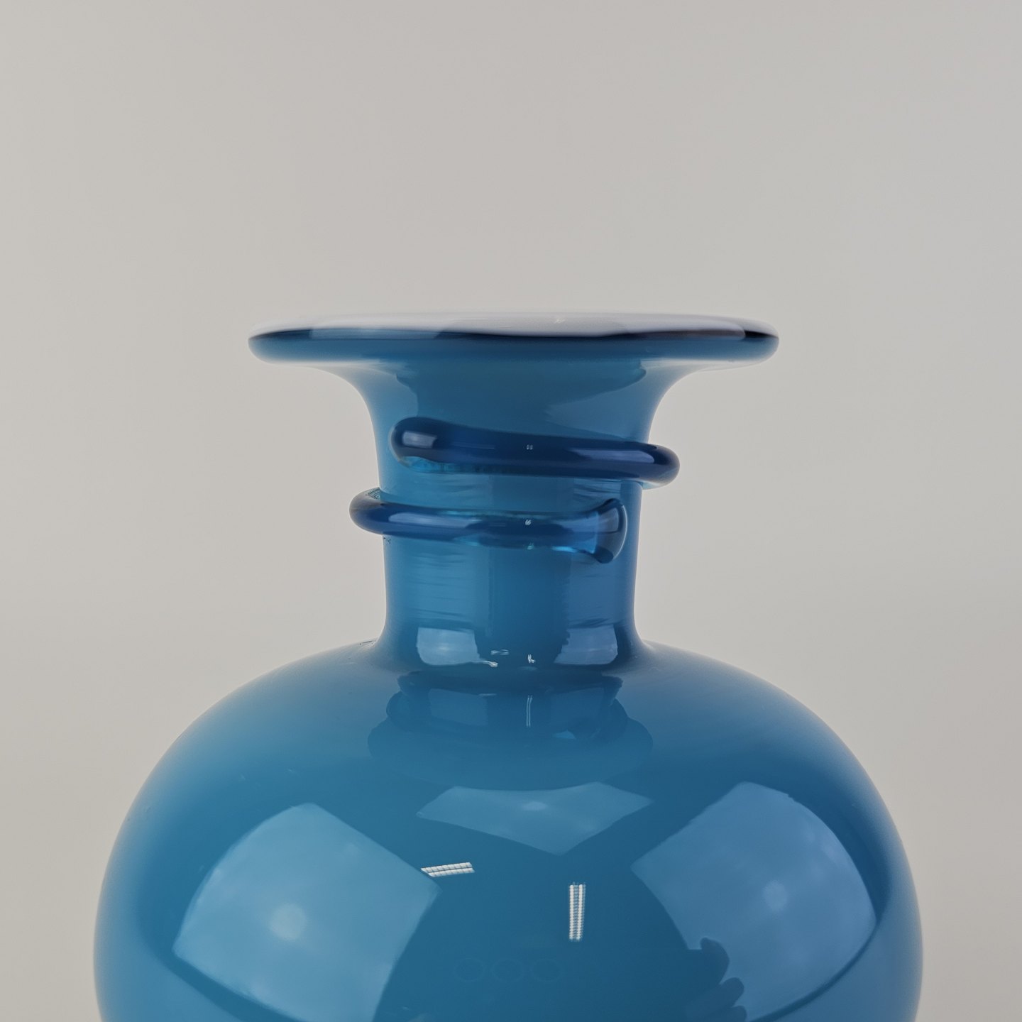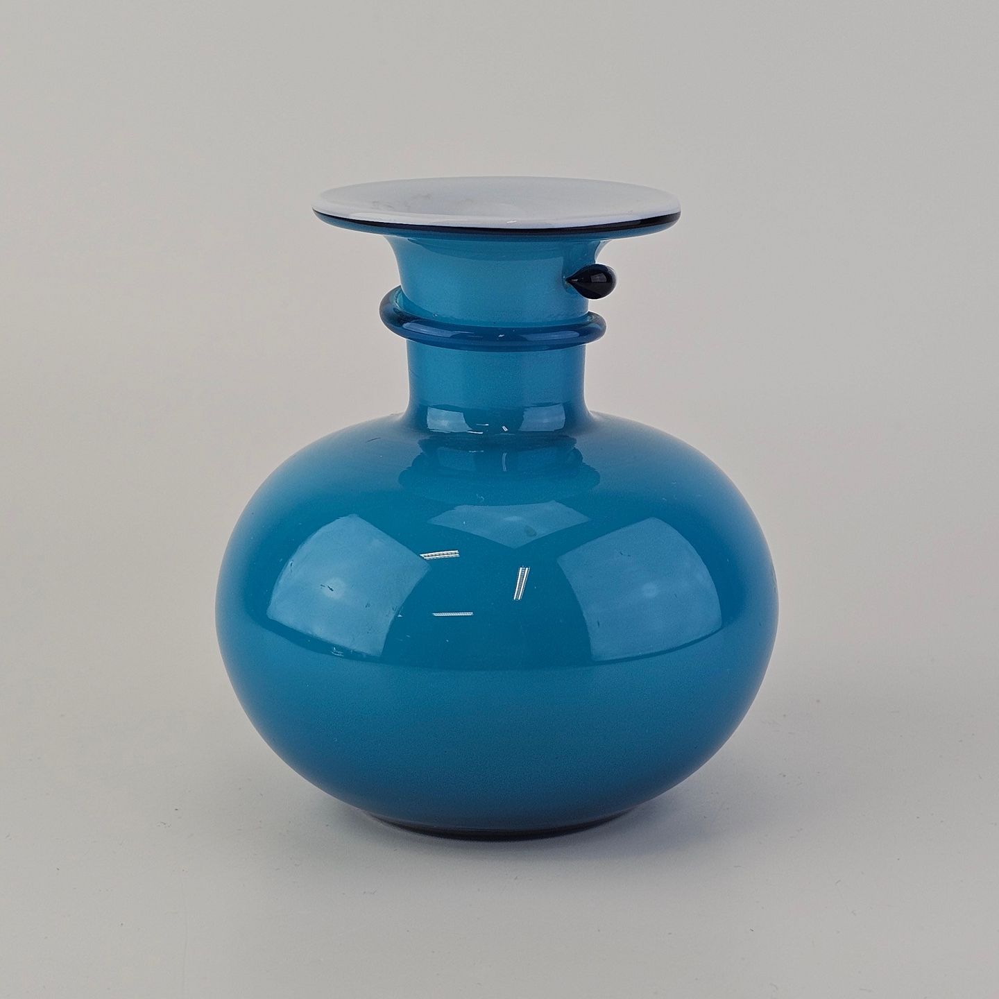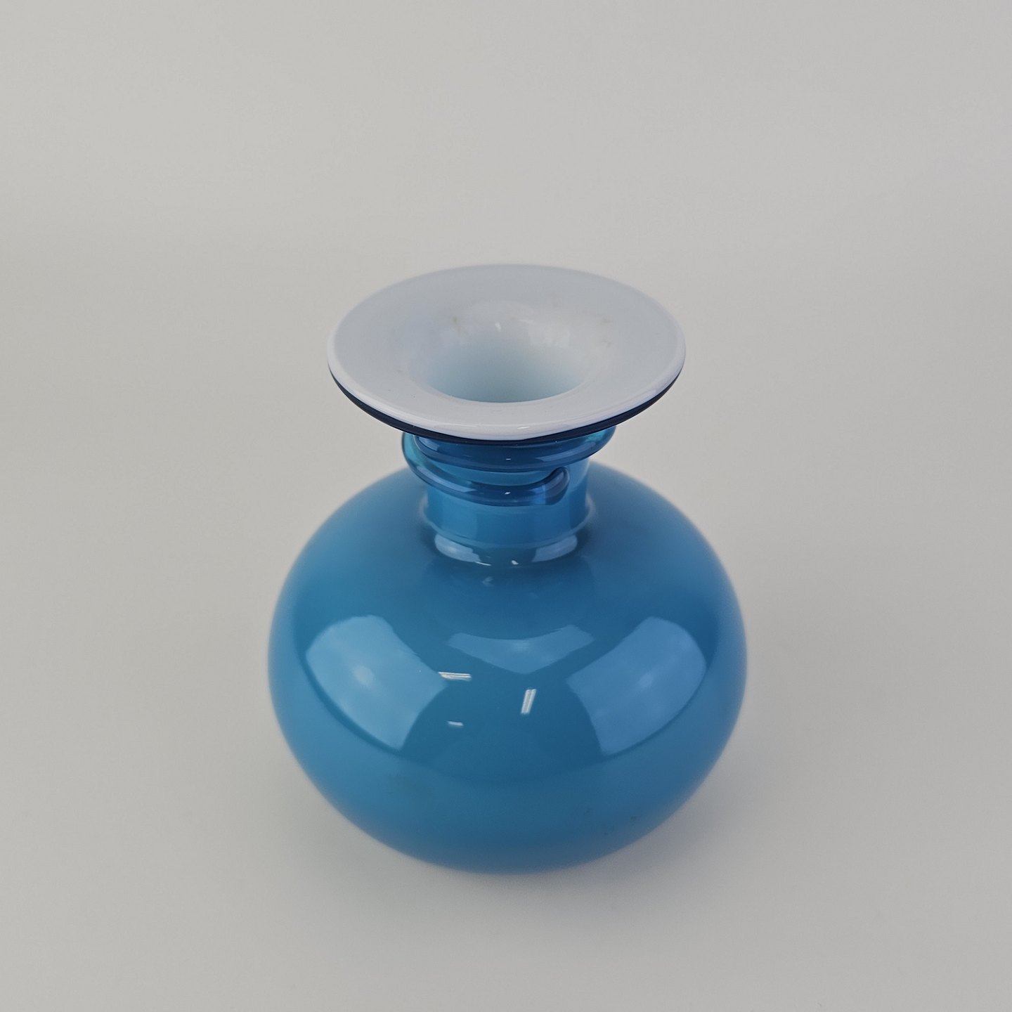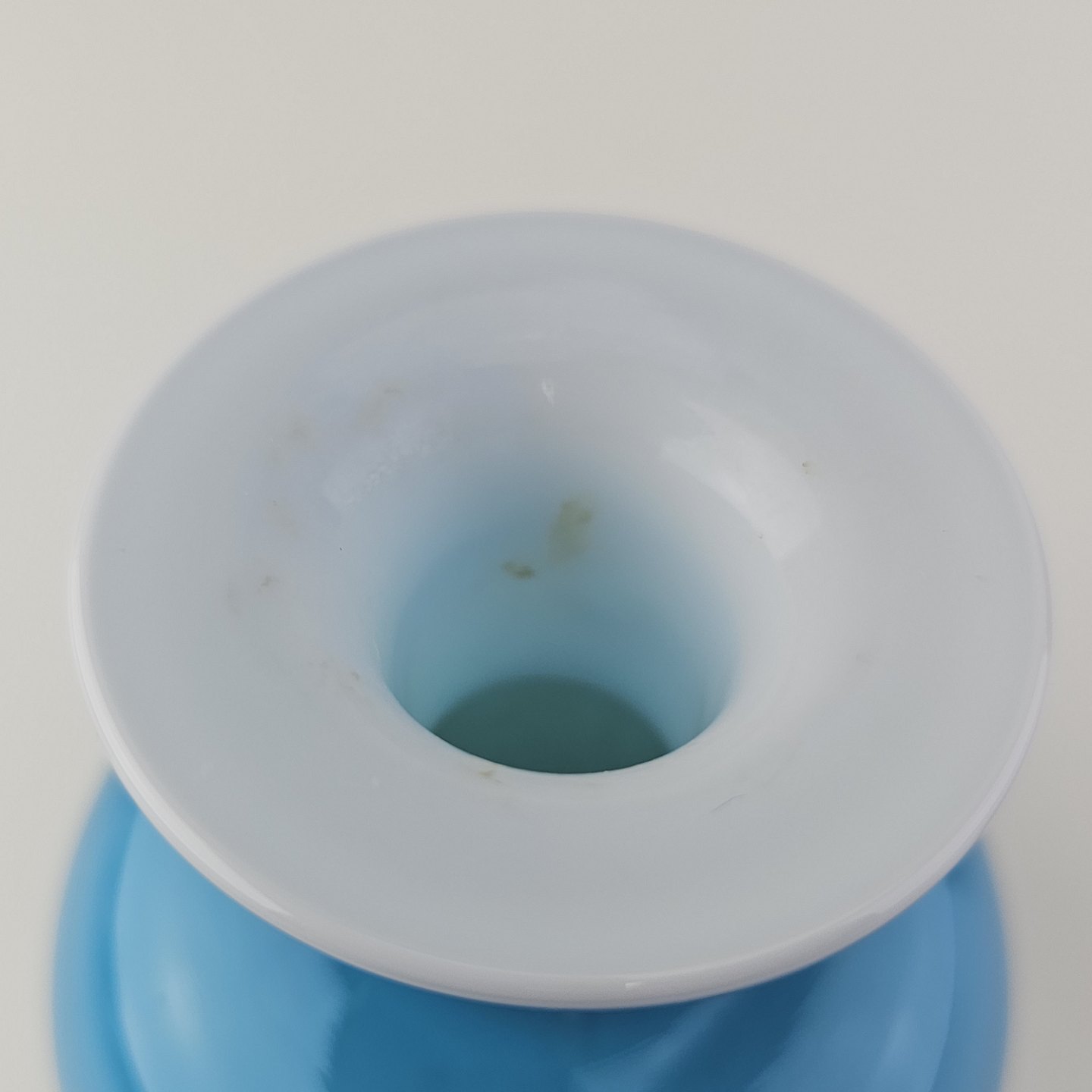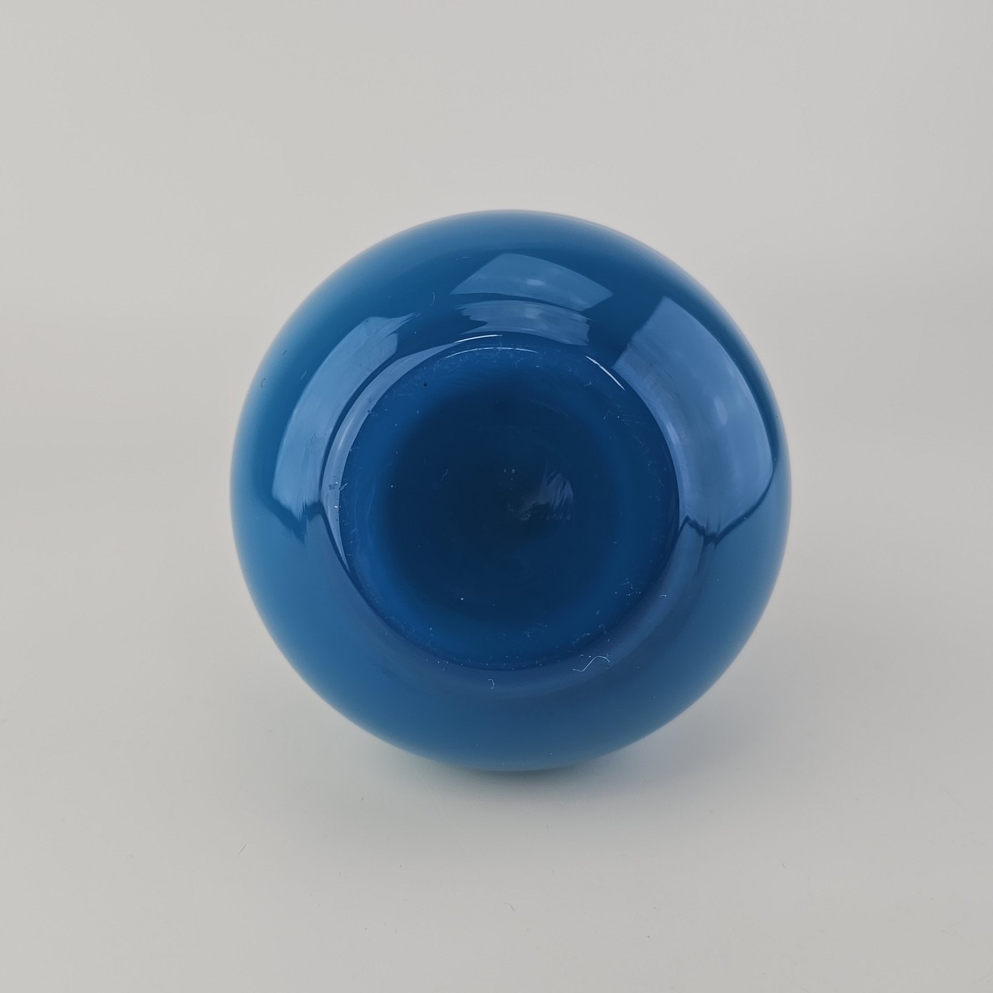 Beskrivelse: Kugleformet Napoli glasvase i blåt opalglas med hvid inderside