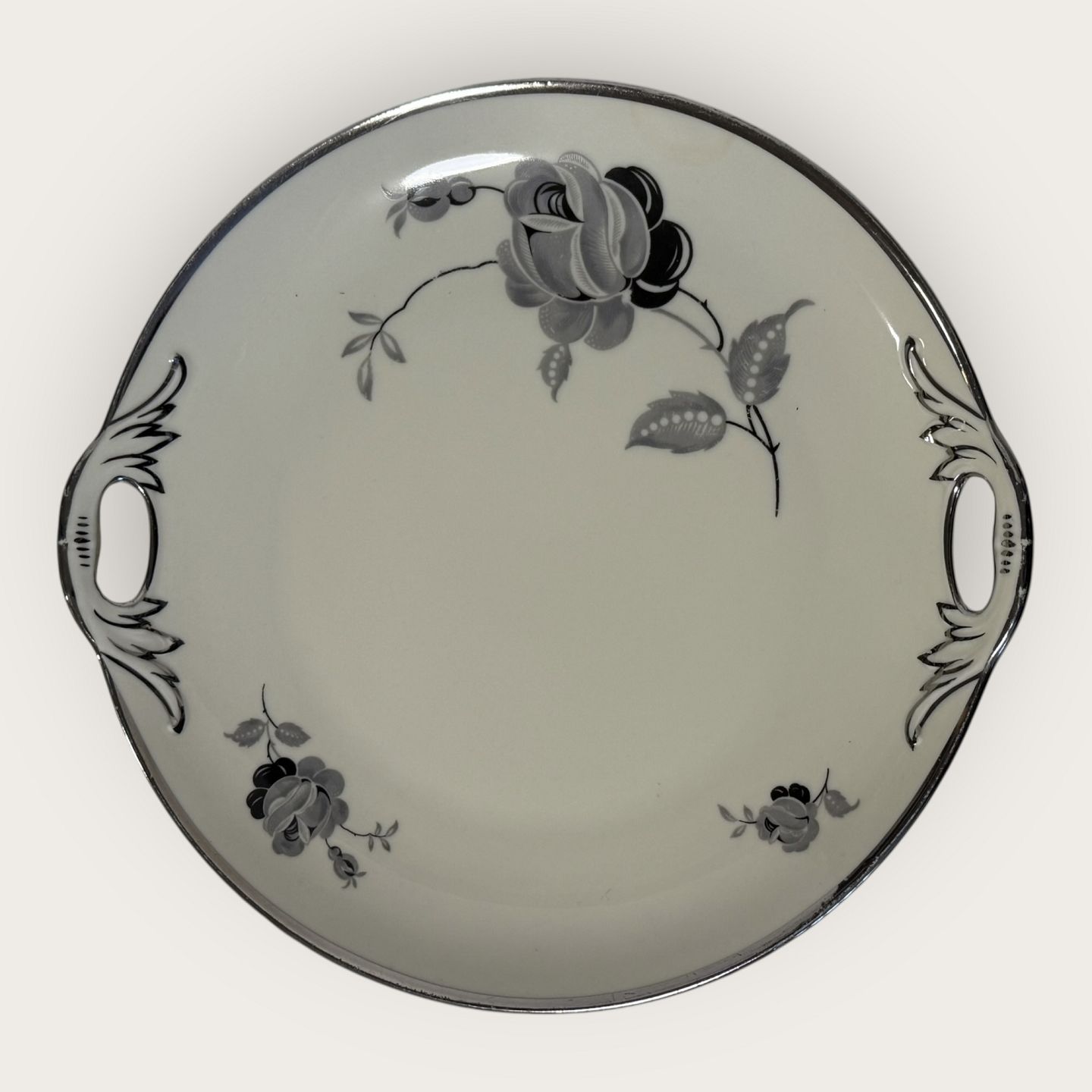 Description: Black rose, with Plantin edge, KPM, Lyngby, Cake dish with handle, Dimensions: 24.5x25.5cm *Good condition*