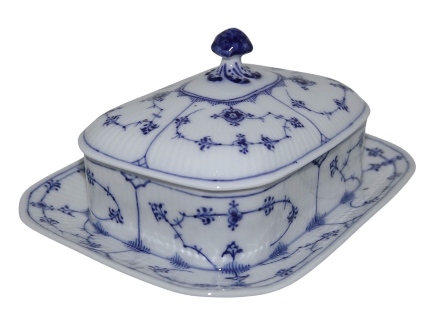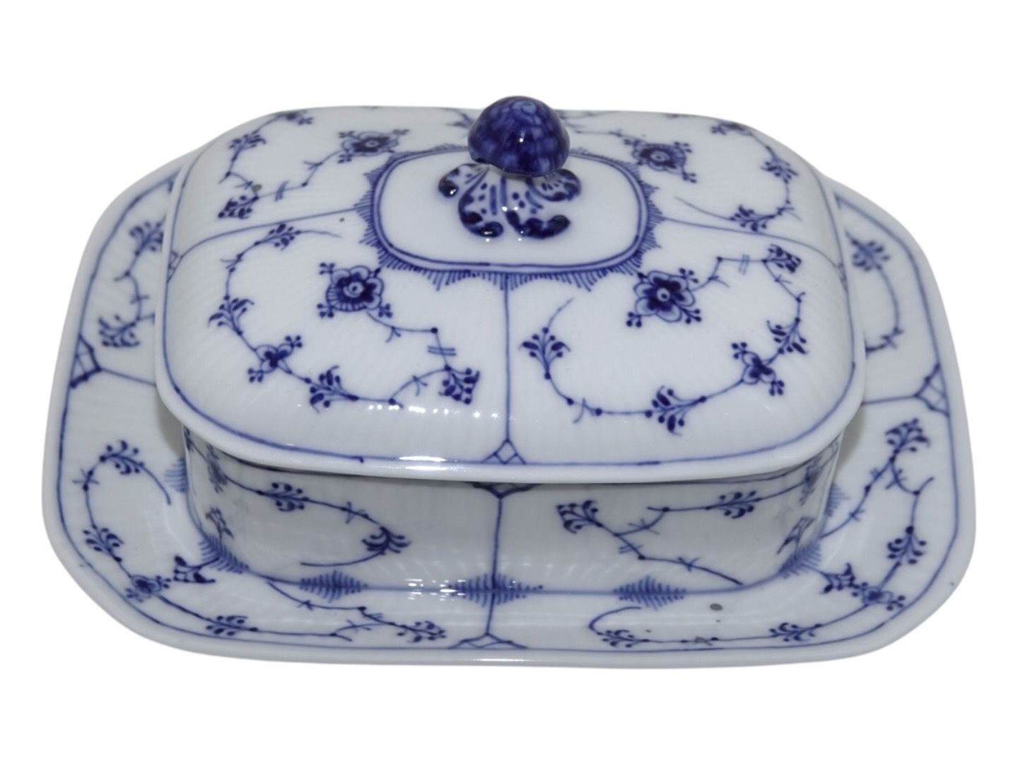 Beskrivelse: Royal Copenhagen Musselmalet Riflet, meget sjælden sardindåse.