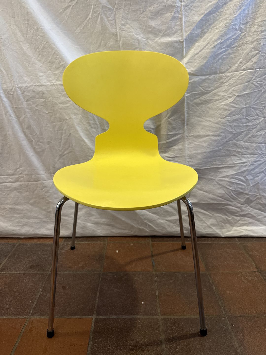 Beskrivelse: Arne Jacobsen Myrestol gul malet stel i forkromet metal.