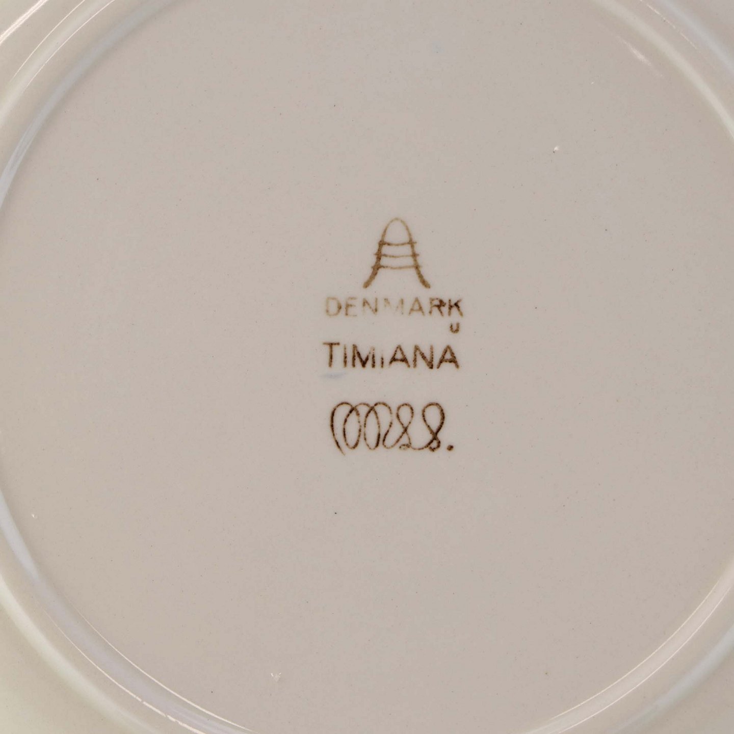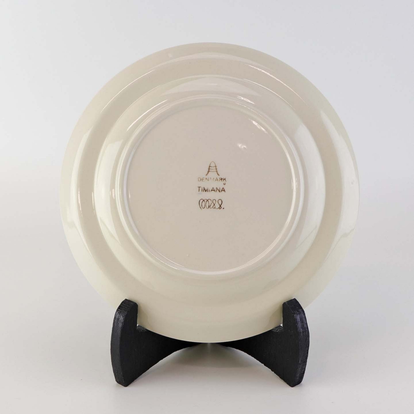 Beskrivelse: Kagetallerken i fajance fra stellet Timiana fremstillet i perioden 1960-1969