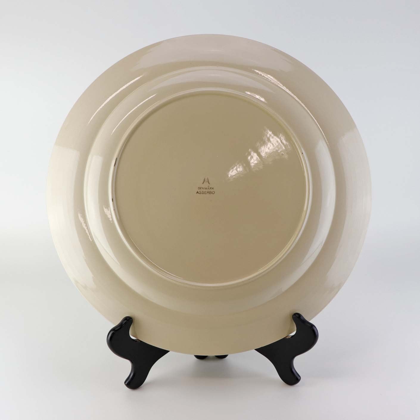 Beskrivelse: Stort rundt serveringsfad i fajance fra stellet Asserbo fremstillet i perioden 1933-1965
