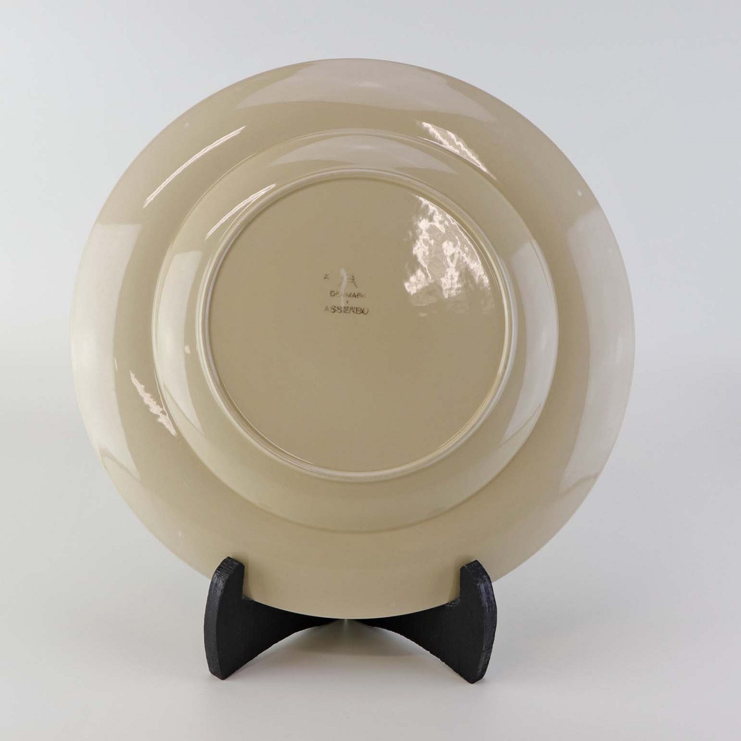 Beskrivelse: Flad tallerken i fajance fra stellet Asserbo fremstillet i perioden 1933-1965