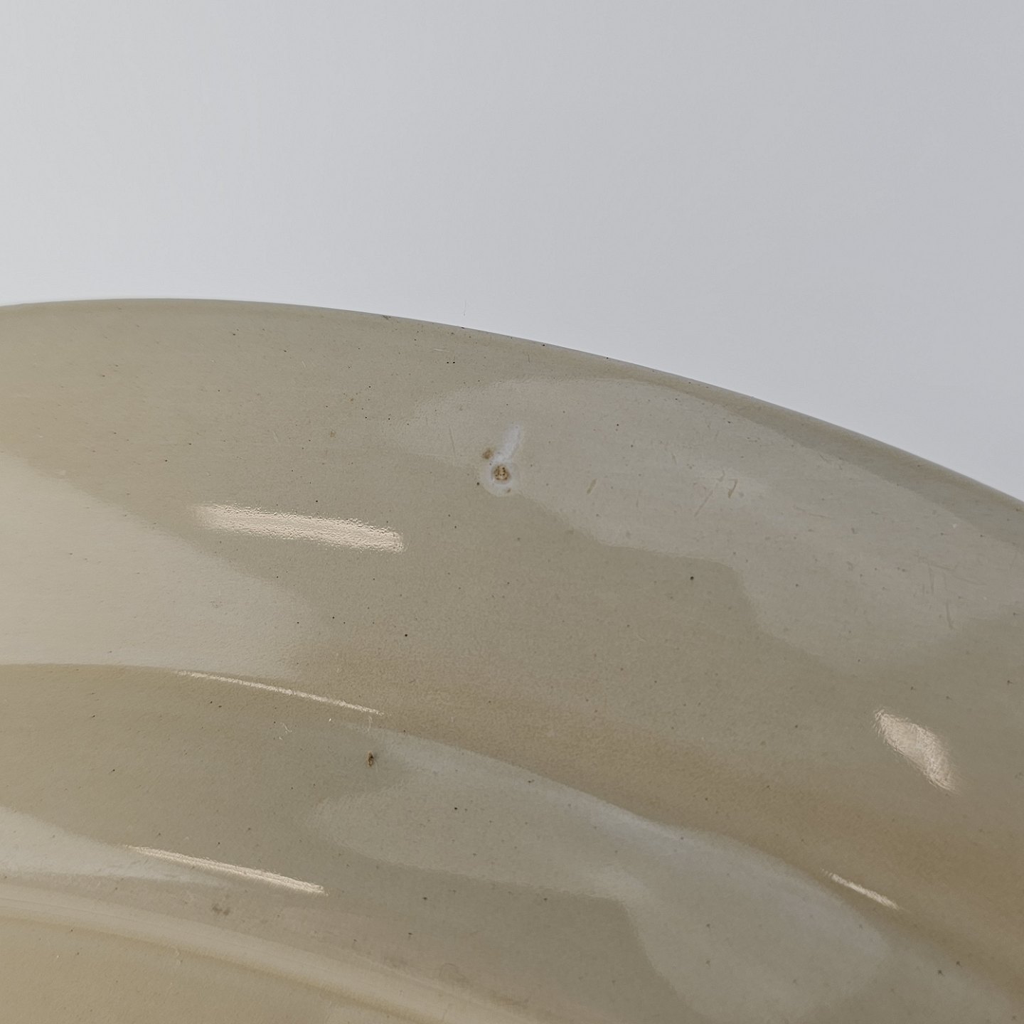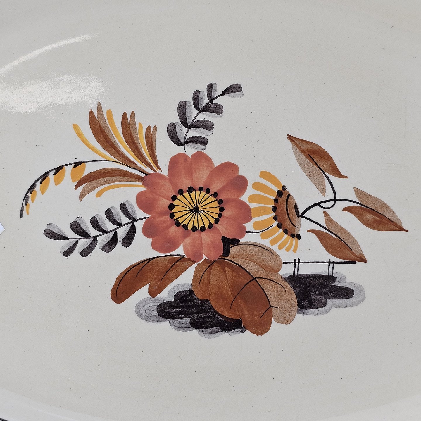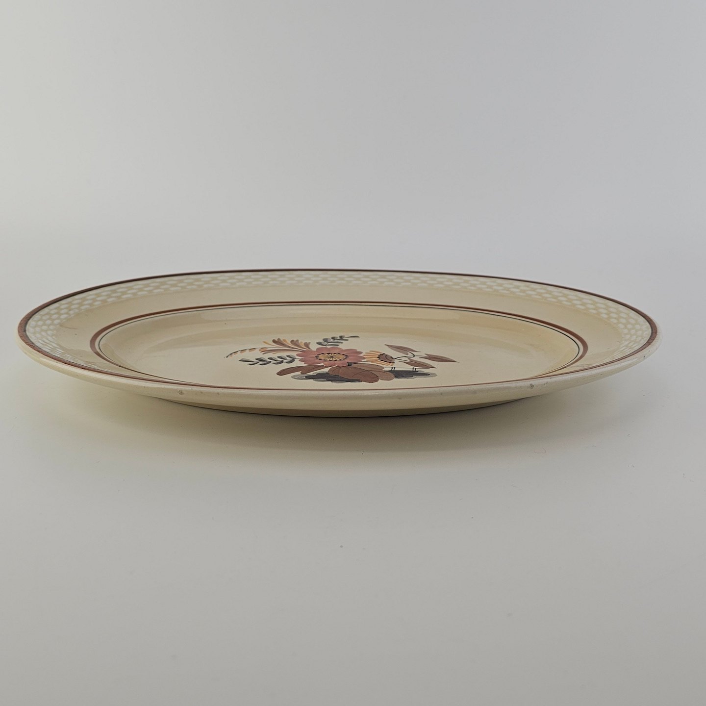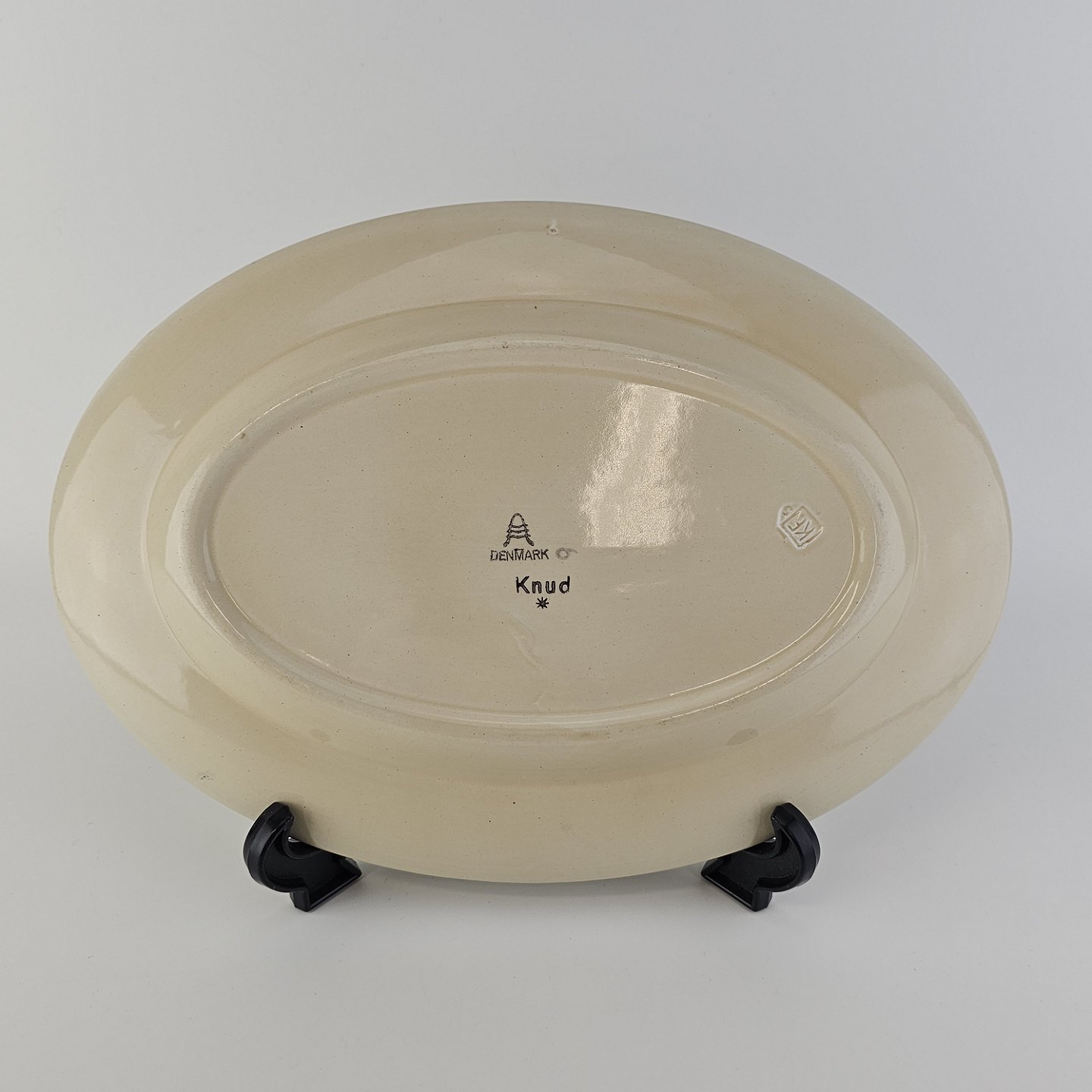 Beskrivelse: Lille ovalt fad i fajance fra stellet Knud