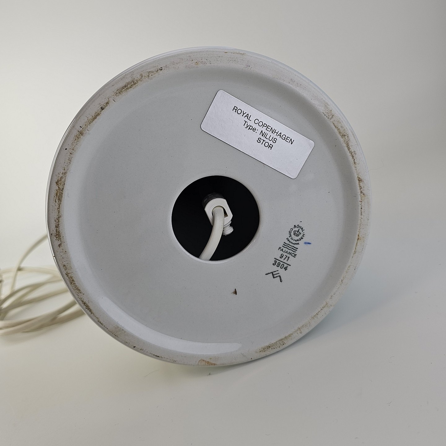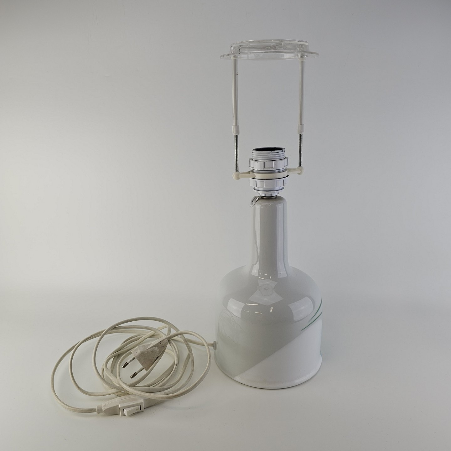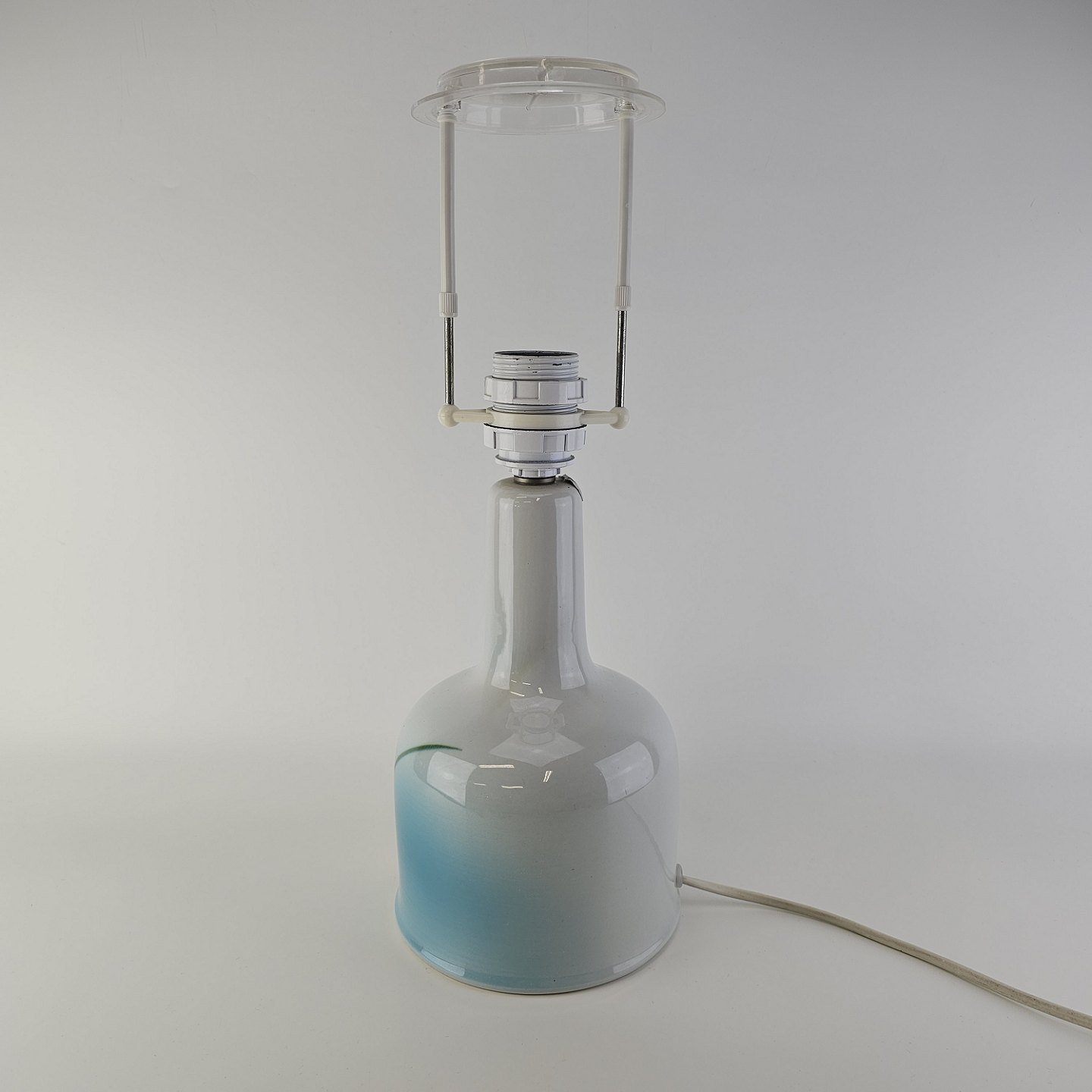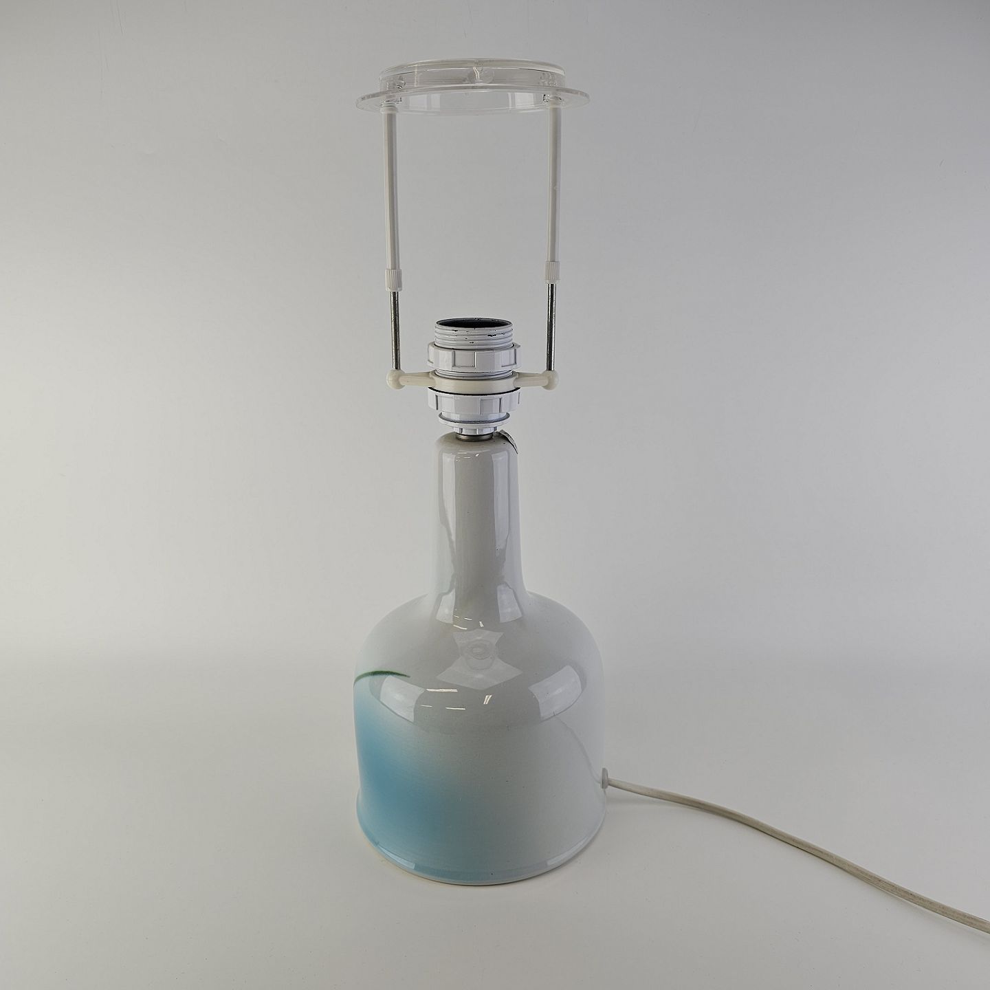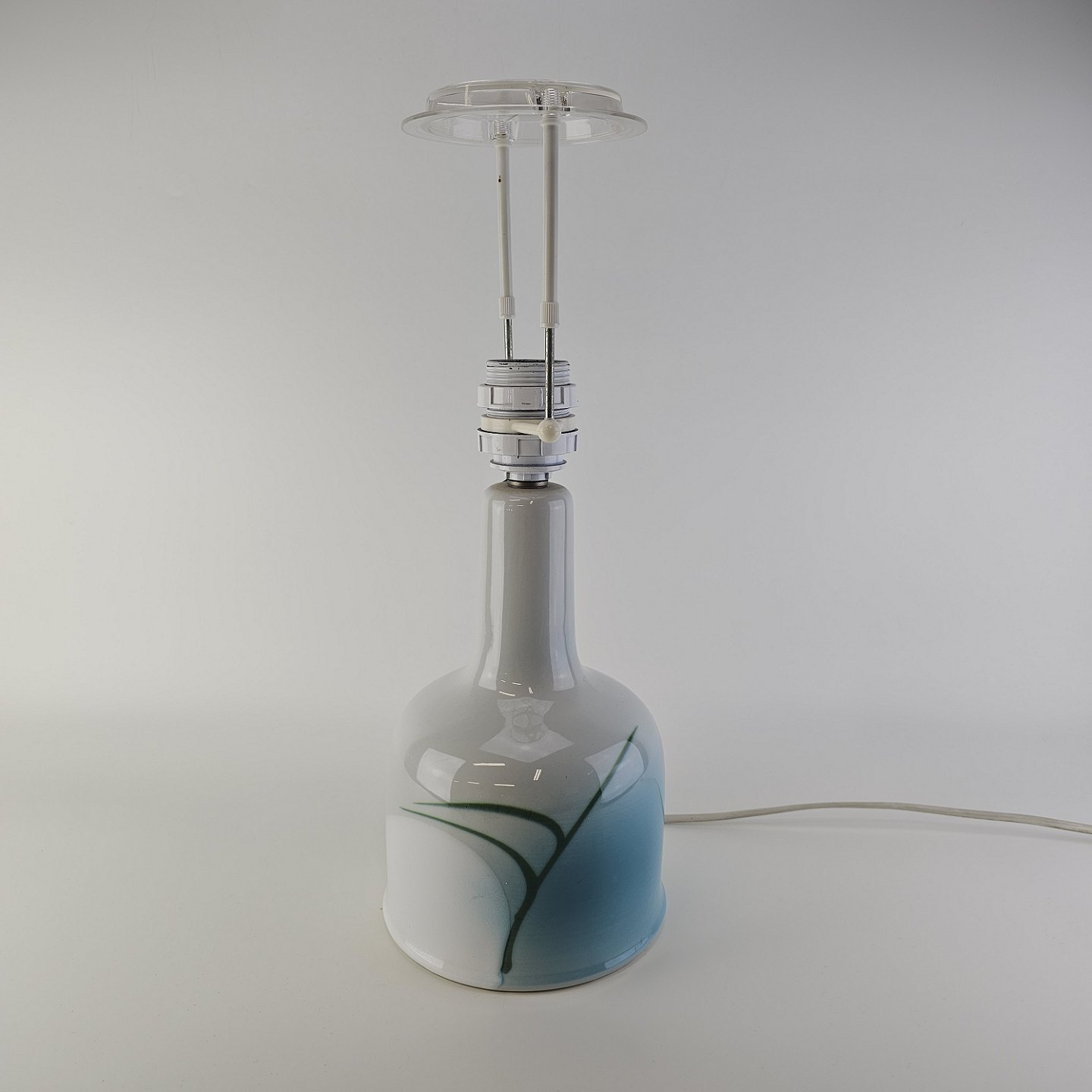 Beskrivelse: Lampefod i hvid fajance med dekoration af blå graduering og sorte streger, model Nilus