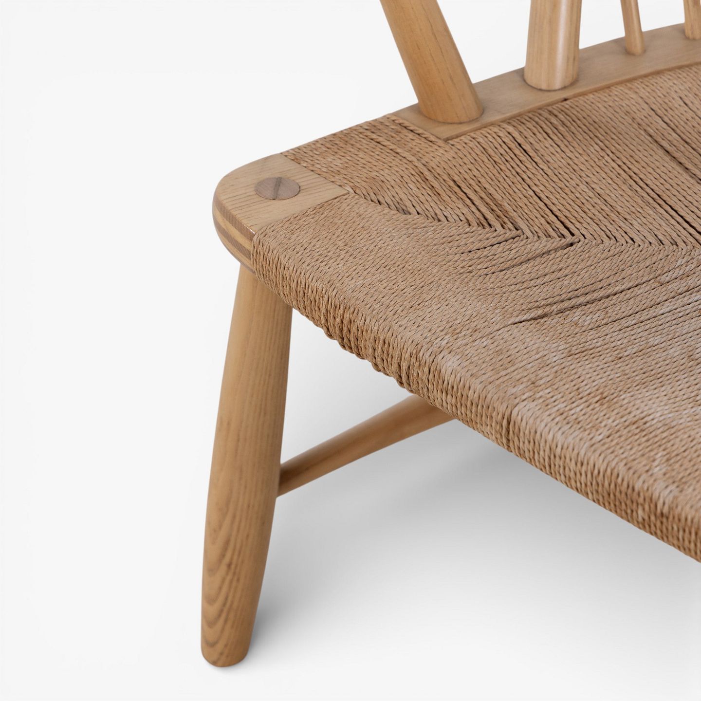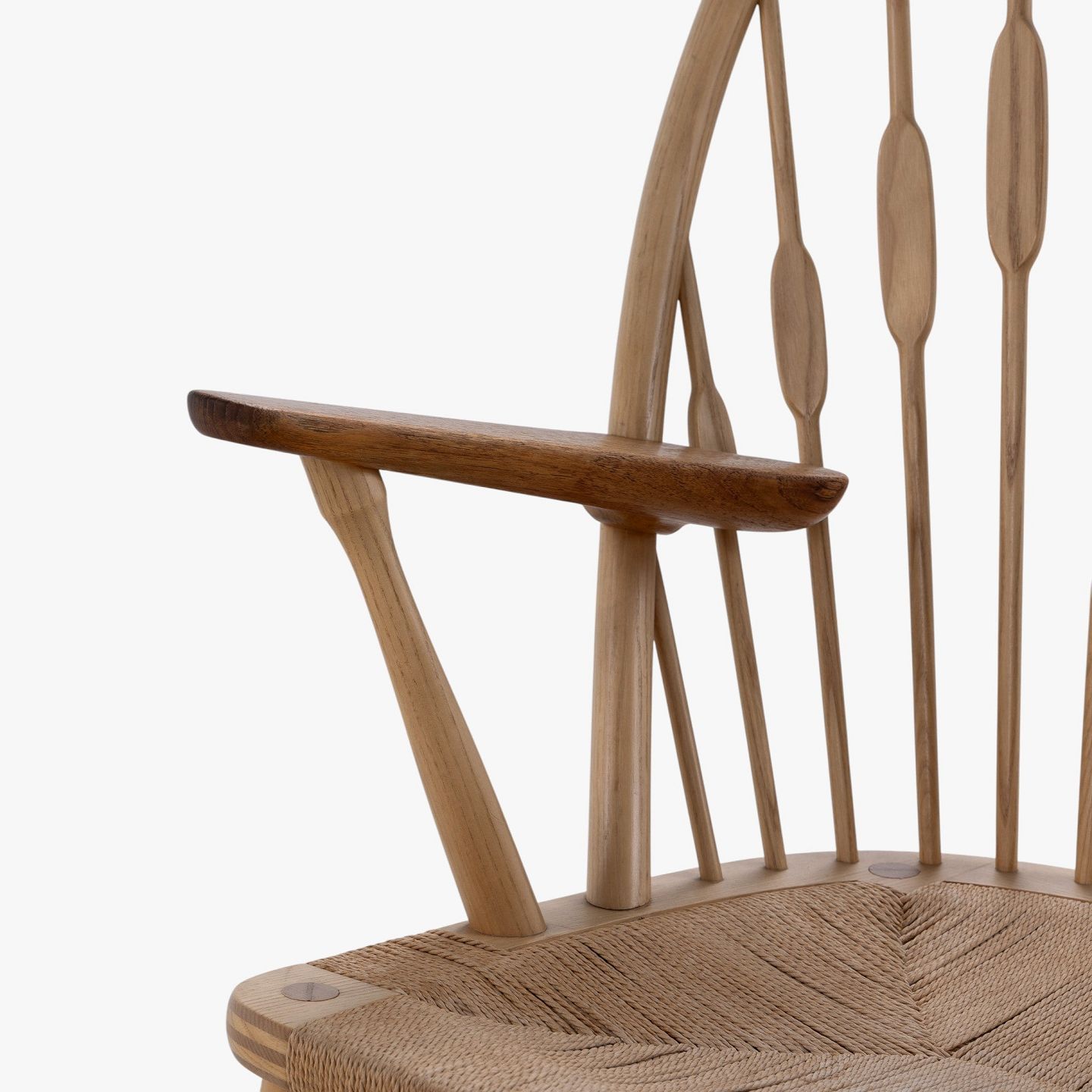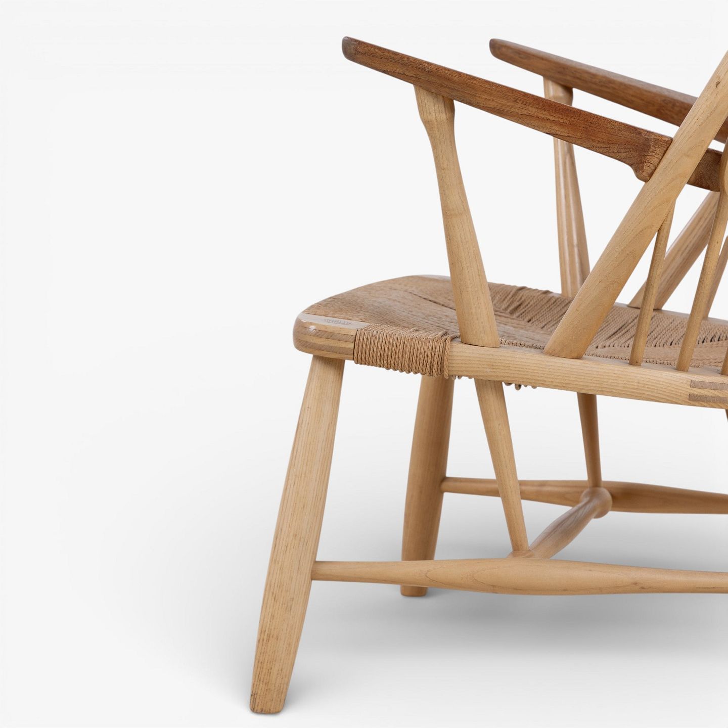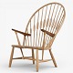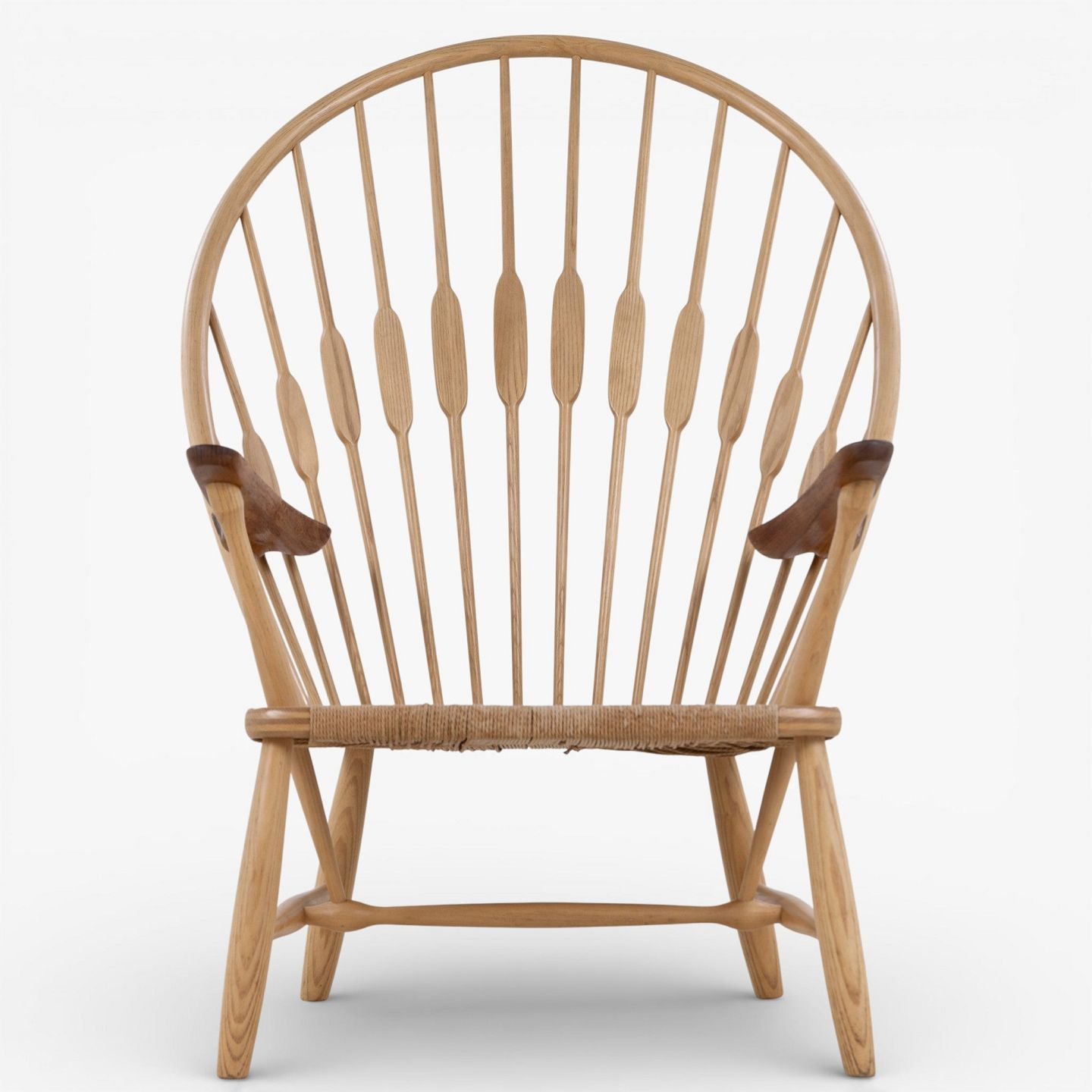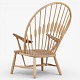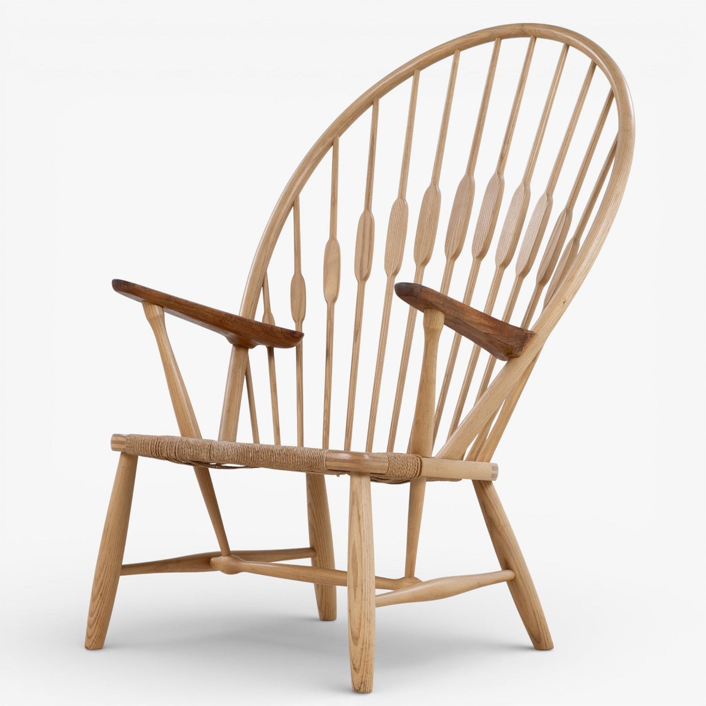 JH 550 - 'Påfuglestolen'-lænestol i patineret ask med armlæn i teak og sæde i flettet papirgarn. Brændemærket fra producent.
