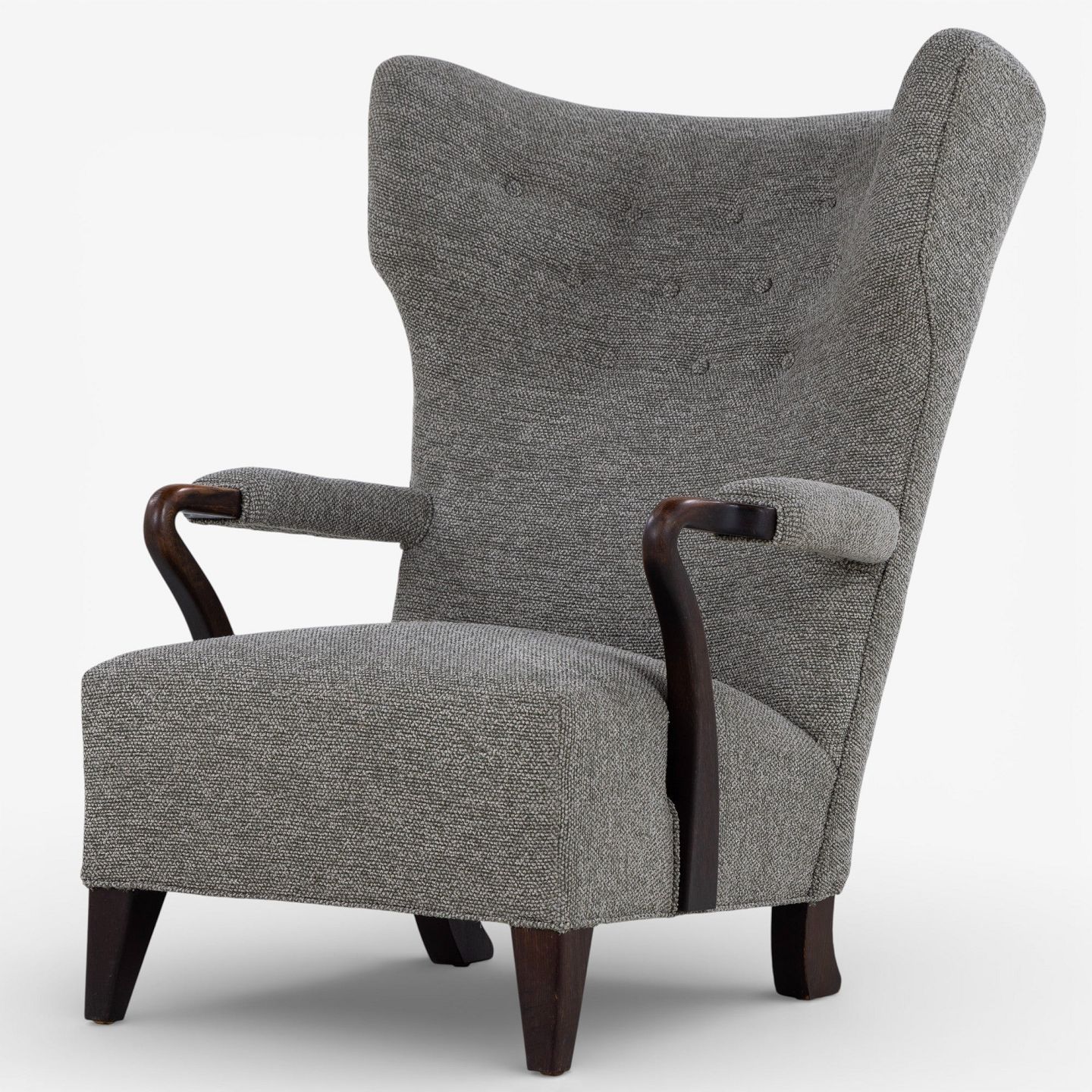 Højrygget lænestol betrukket med nyt 'Moss'-tekstil (farve: 0002) m. arme og ben i bejdset eg.