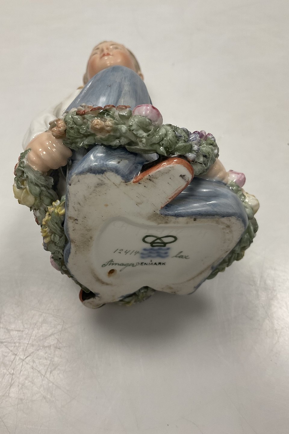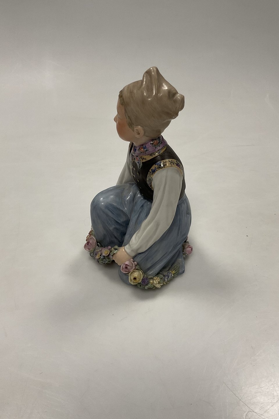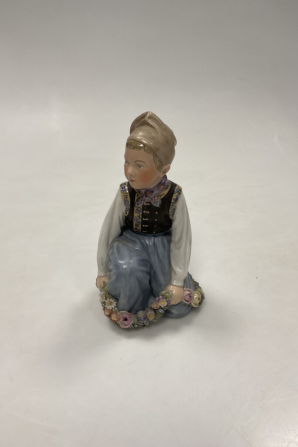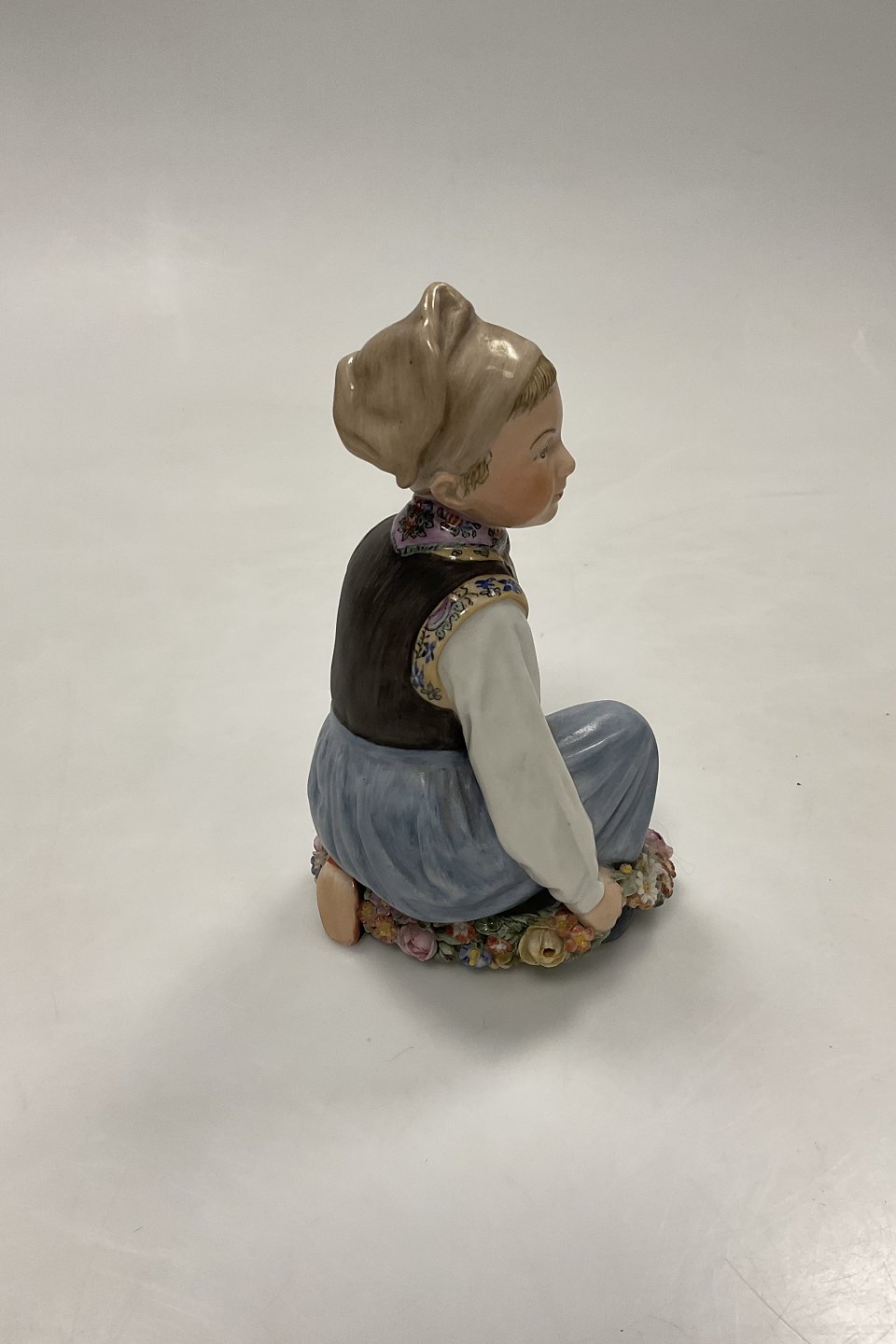 Description: Royal Copenhagen overglaze figurine Amager Boy No. 12414. Measures 15cm (5 29/32 in.) Has small chips on flowers. Please look at photo.