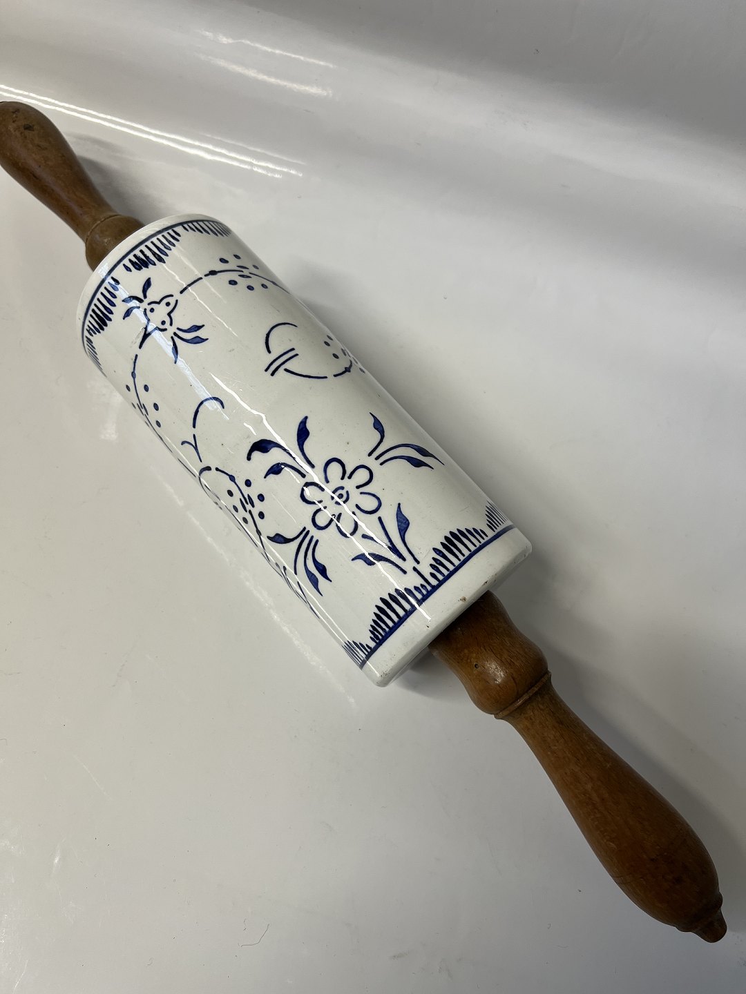 Kagerulle Musselmalet fajance med træ hank.
