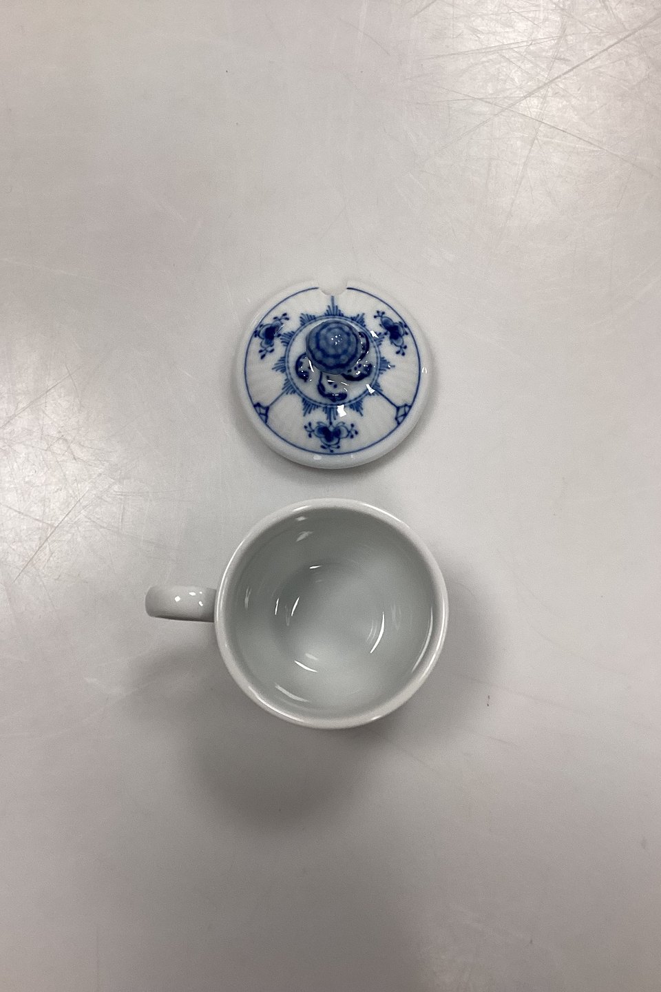Beskrivelse: Royal Copenhagen Musselmalet Riflet Sennepskrukke / Cremekop med låg No. 200 med låg No. 199.