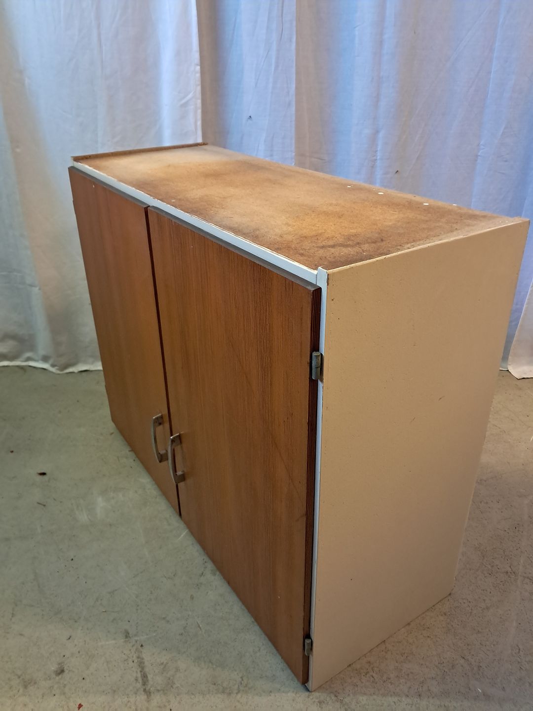 Beskrivelse: Gammelt malet køkkenskab med låger i origon pine, fra 1960erne.
