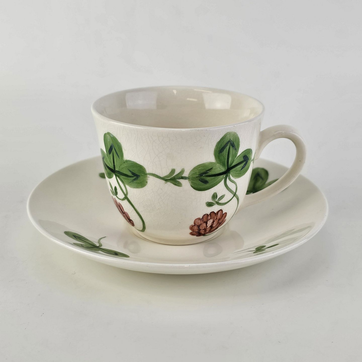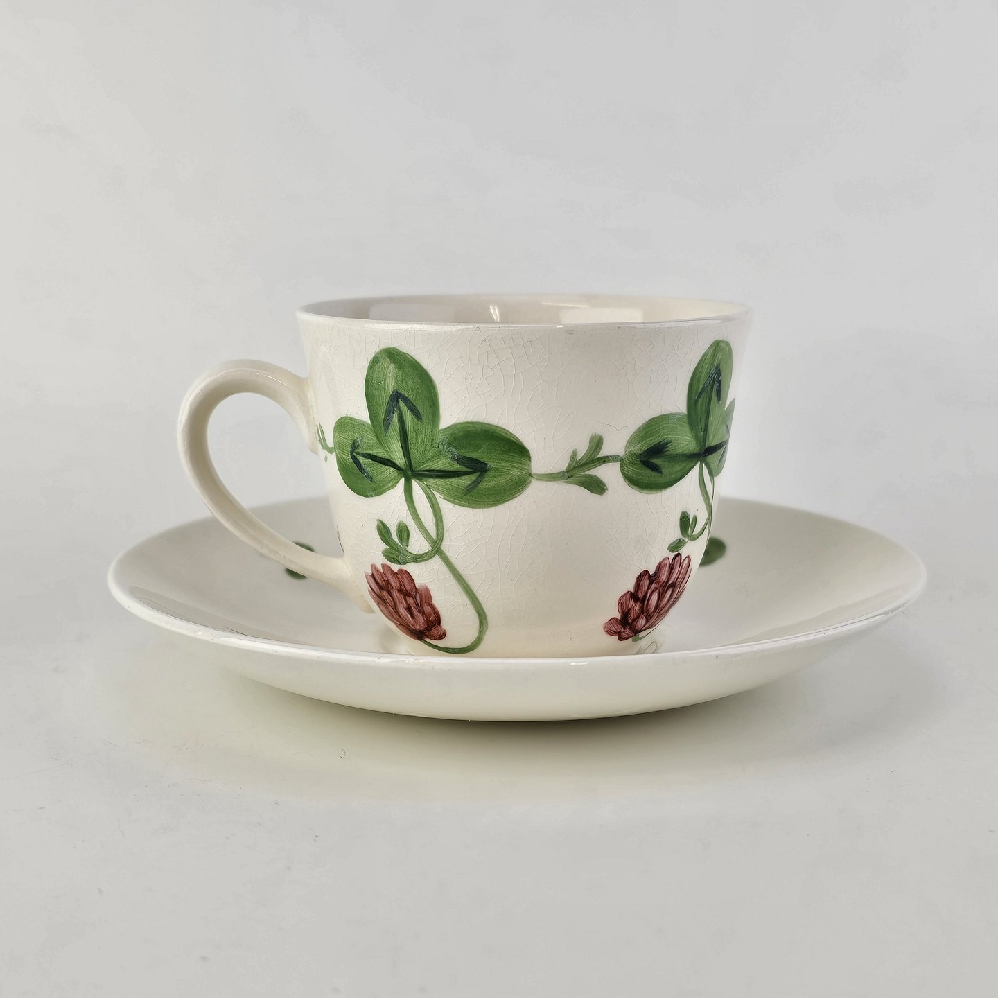Kløver er fajancestel med motiv af rødkløver på lys baggrund.