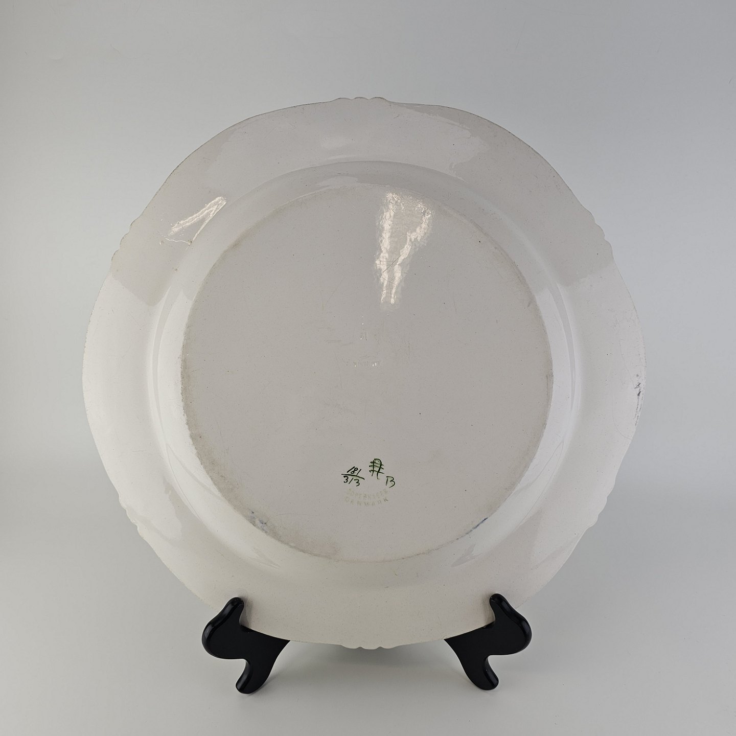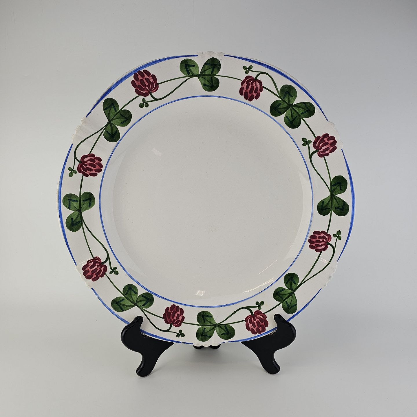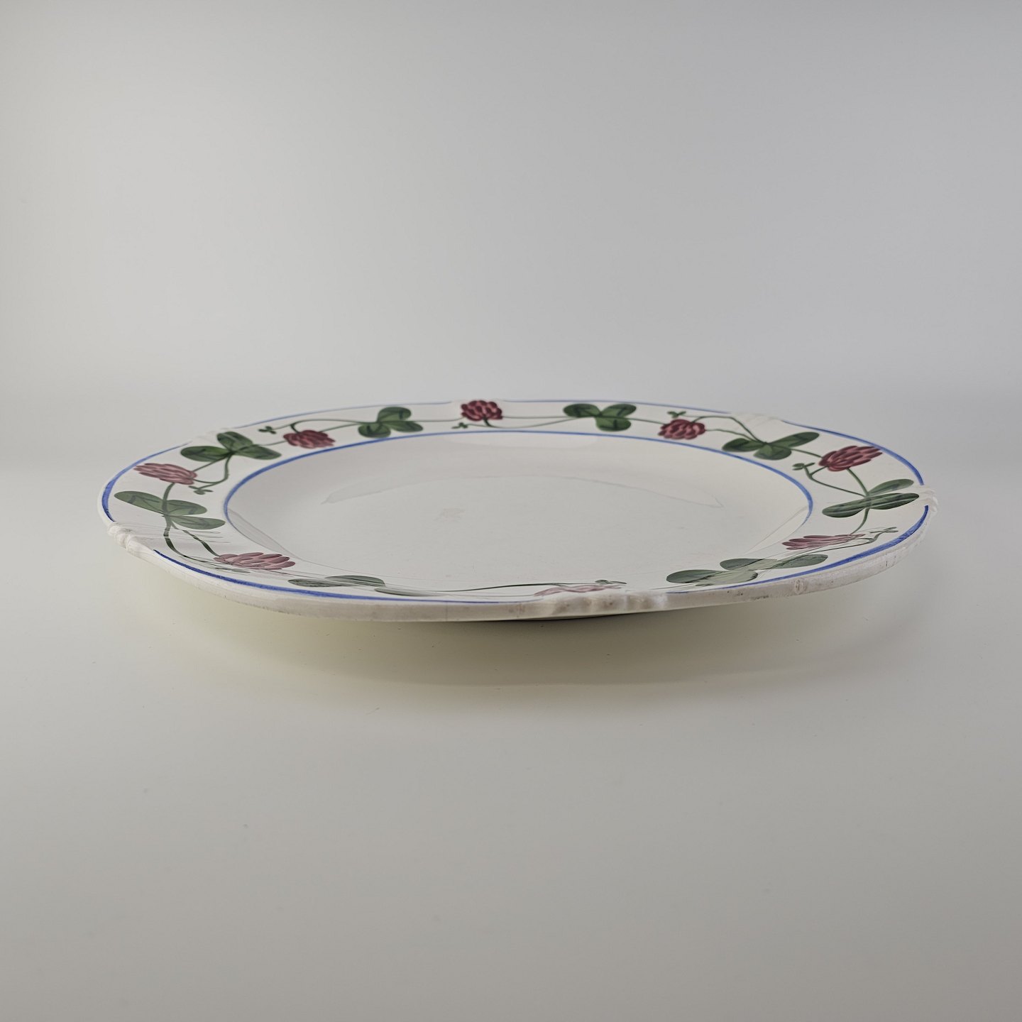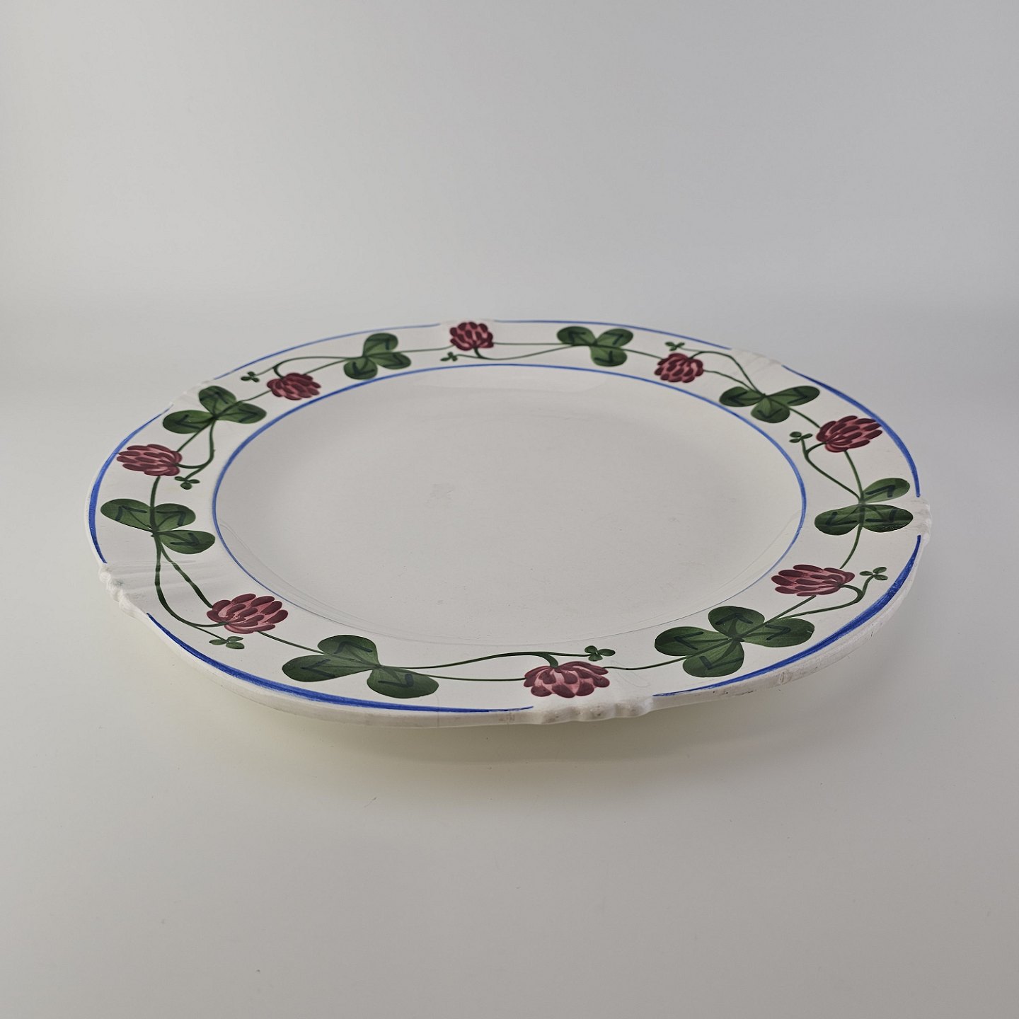 Beskrivelse: Rundt fad i kunstfajance fra stellet Kløver. Nr. 181/313