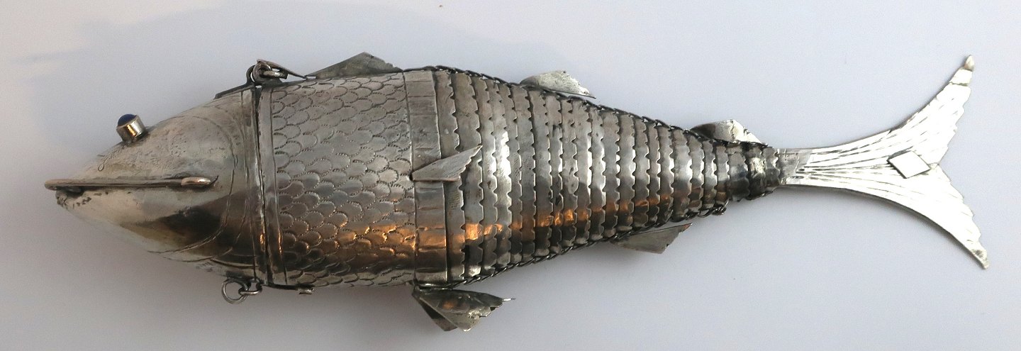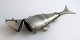 Beskrivelse: Sølv hovedvandsæg i form af stor fisk med blå sten. Længde 23,5 cm