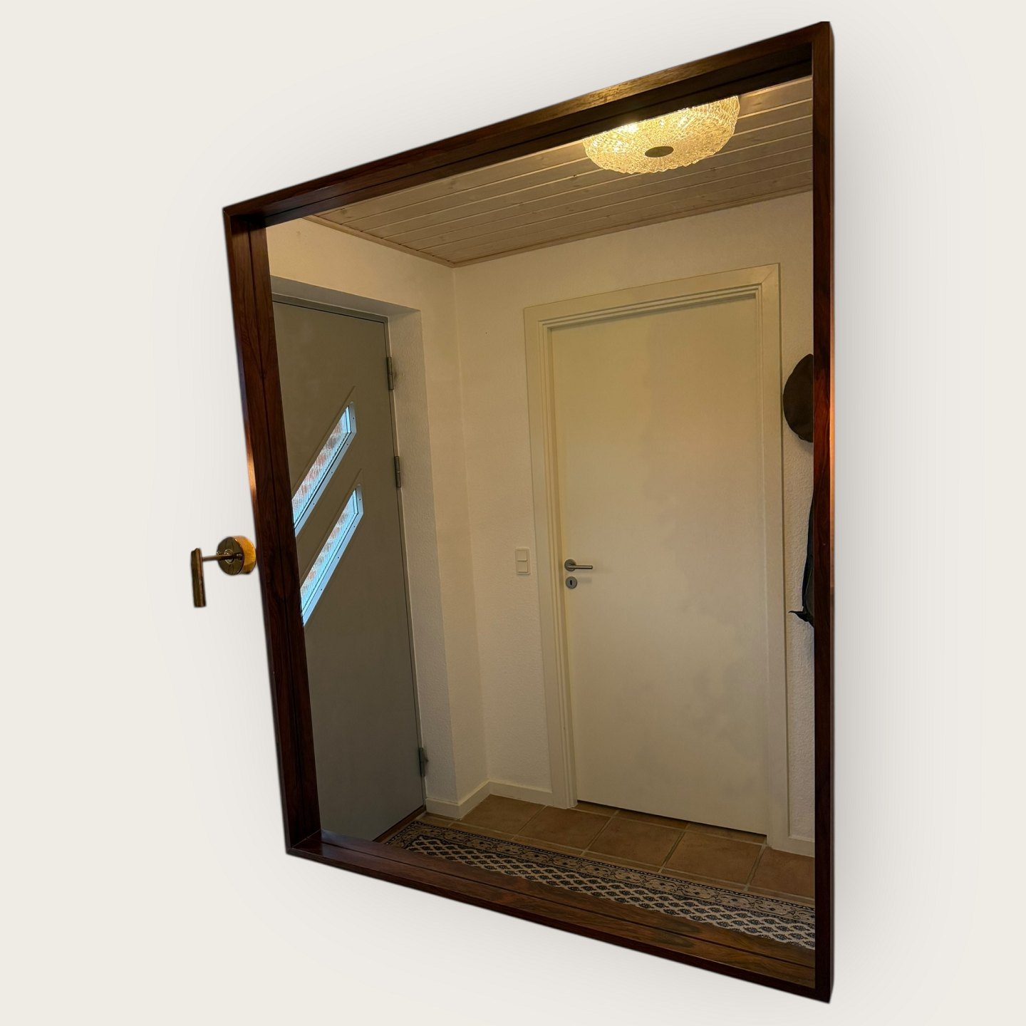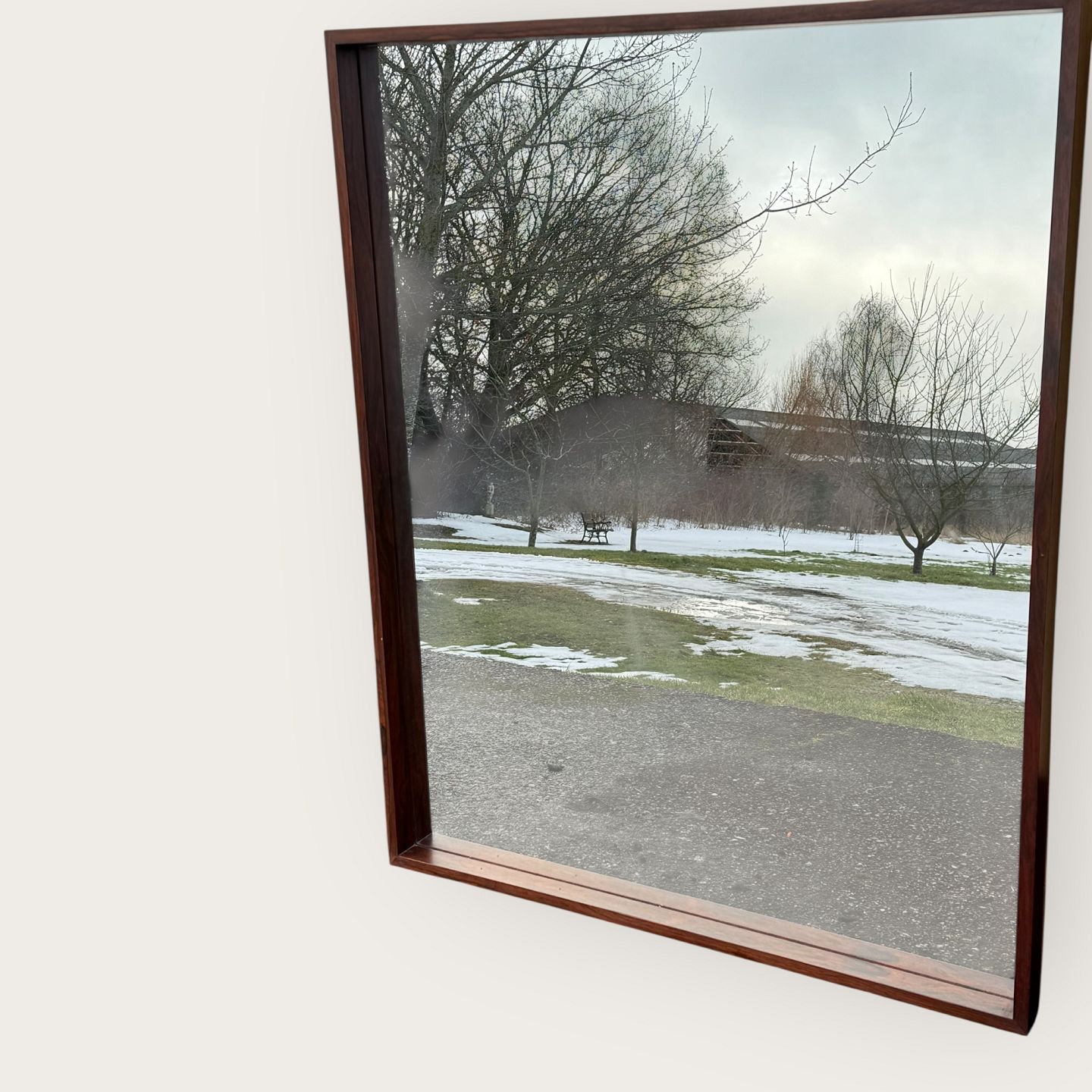Beskrivelse: Stort palisander spejl med kraftig ramme. Har været entresæt sammen med skænken varenr. 632824, Udgået og mærket fra Illums Bolighus, Mål: 100x123cm *Flot stand*