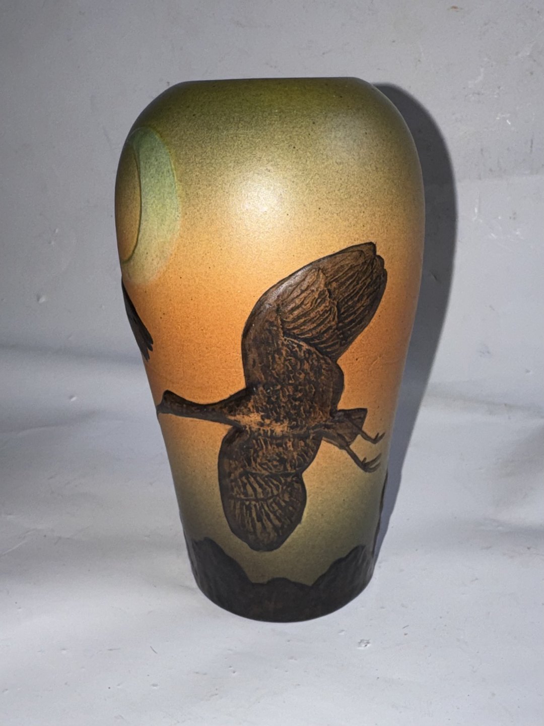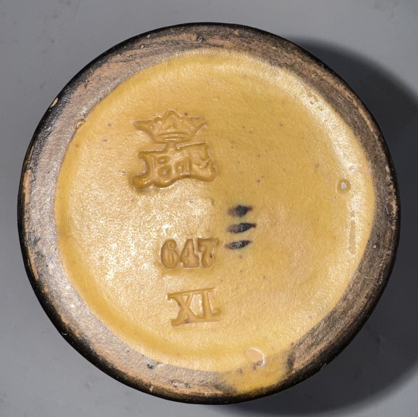Beskrivelse: Vase i keramik fra den københavnske lervarefabrik Peter Ipsen ca. 1925. Dekoreret med en stor flyvende fugl. I god stand. Lille “nålestik” på bundens kant (se foto). Fabriksmærket på bunden med P. Ipsen Enke logo (krone over PIE) samt modelnummer 647. H. 14,7 cm.