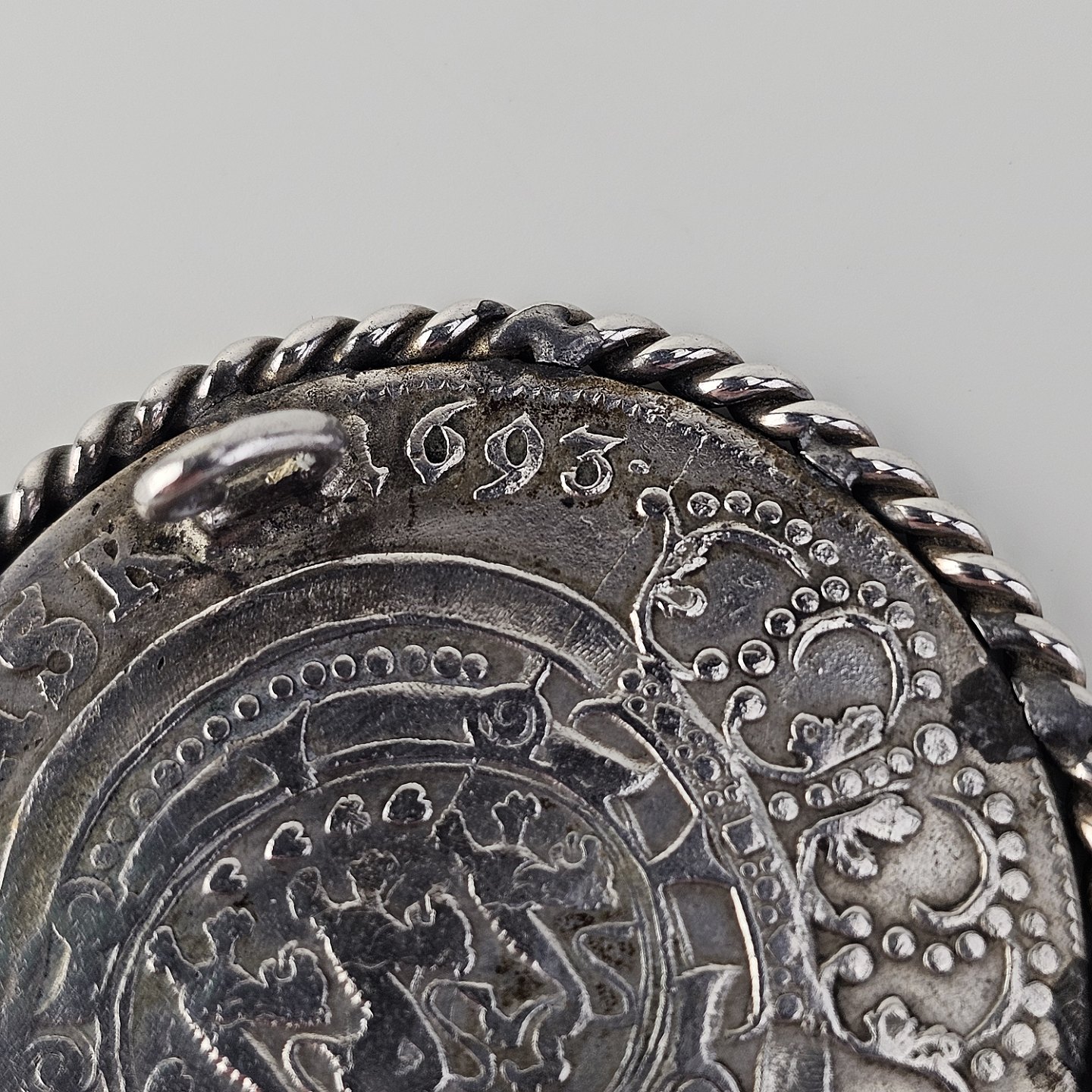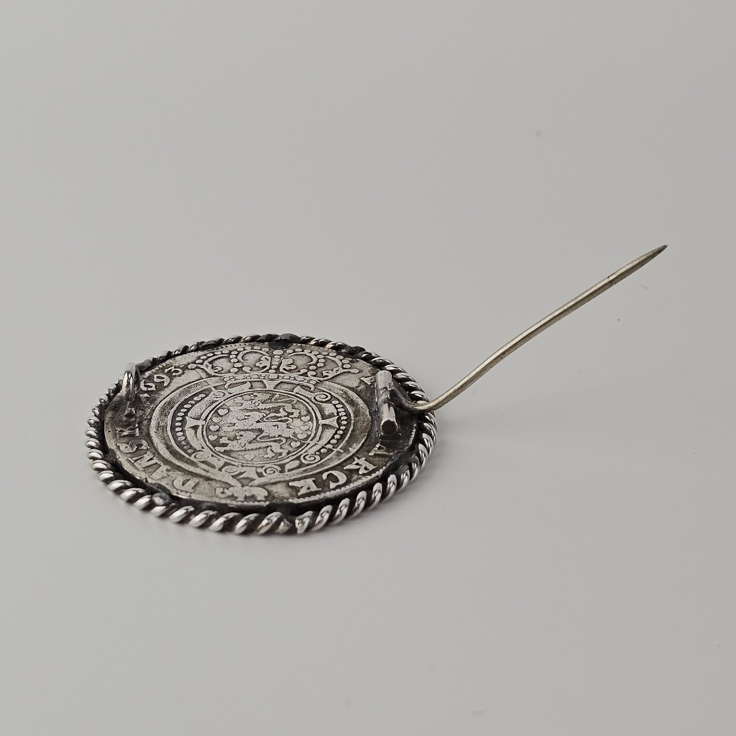 : Broche af en dansk sølvmønt slået i 1693 i Glückstadt
