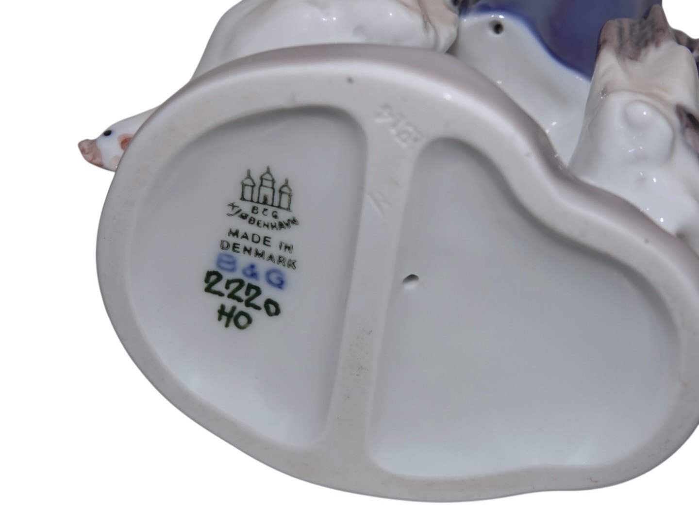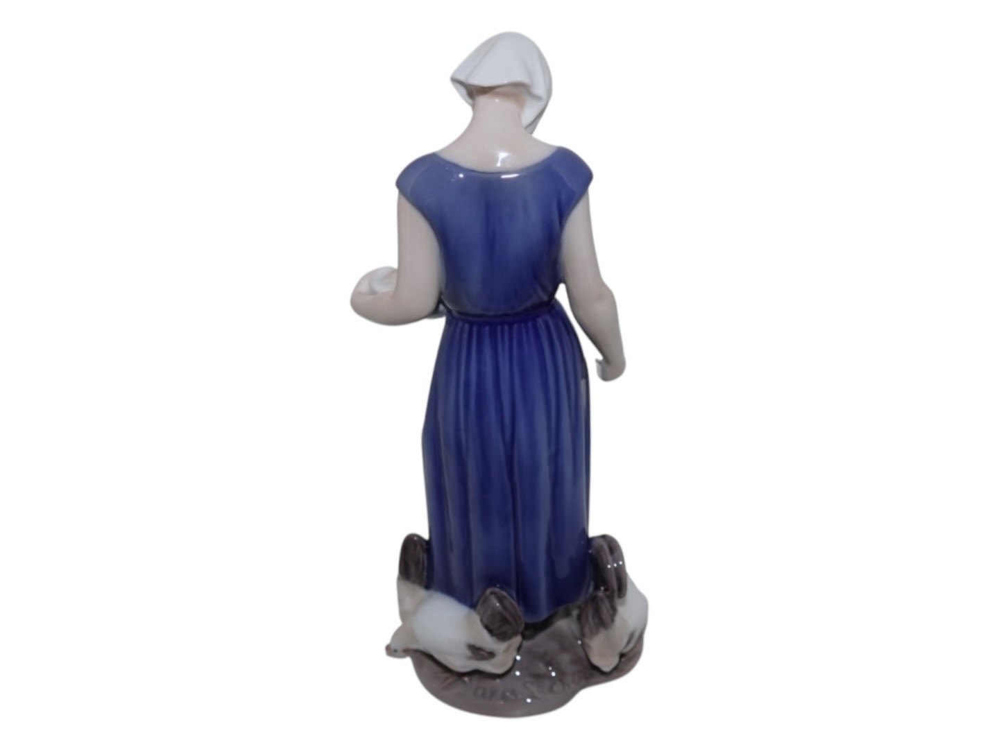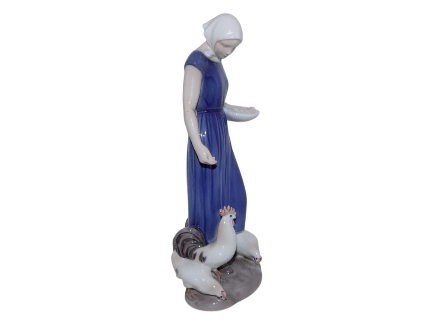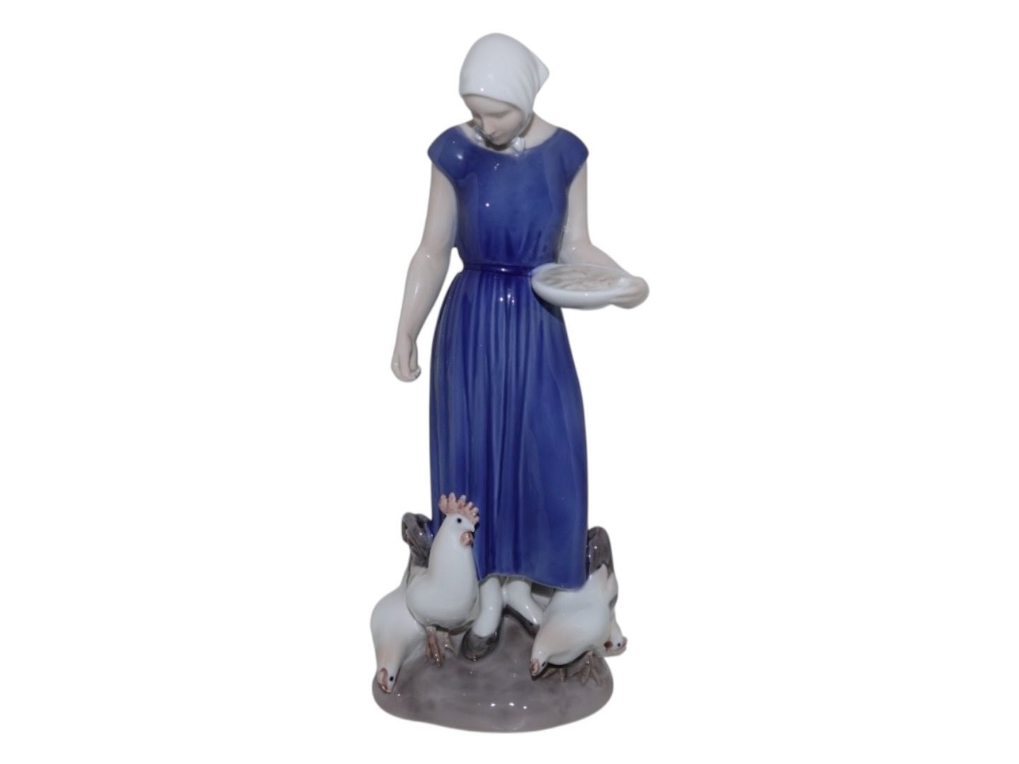Beskrivelse: Bing & Grøndahl Figur, bondepige med tre høns.