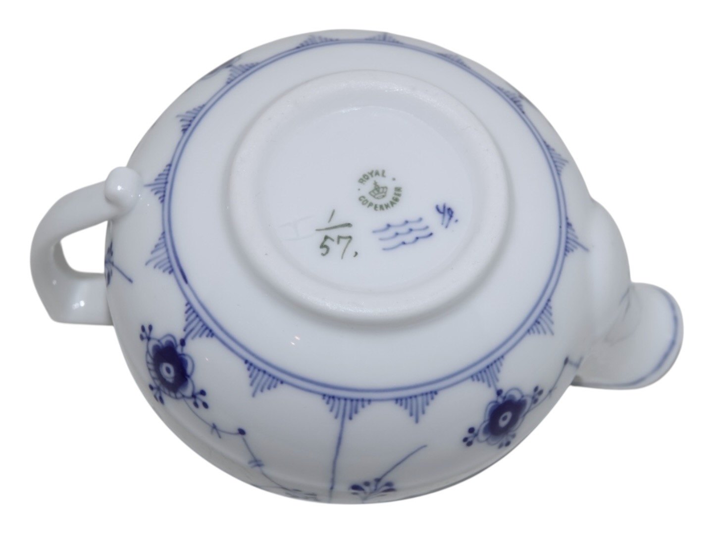 Beskrivelse: Royal Copenhagen Musselmalet Riflet, stor og sjælden flødekande.