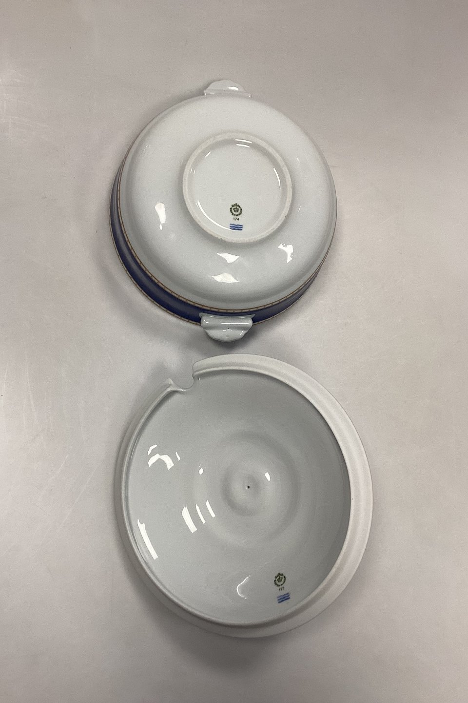 Beskrivelse: Royal Copenhagen Liselund Mørkeblå Terrin med låg No. 174/173