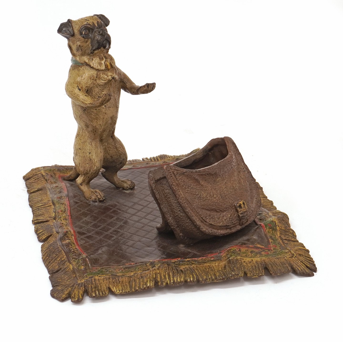 Beskrivelse: Stor wienerbronze i form af hund med taske på tæppe