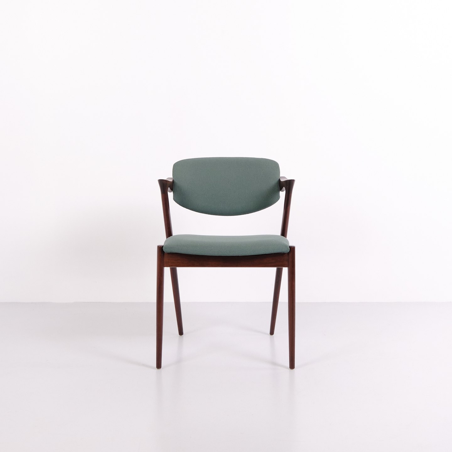 Beskrivelse: Sæt spisebordsstole, model 42, designet af Kai Kristiansen i 1960’erne. Stolene er udført i palisander og er kendetegnet ved deres elegante proportioner, skulpturelle ryg og karakteristiske danske snedkerdetaljer. Model 42 er et markant eksempel på dansk møbeldesign fra midten af det 20. århundrede.