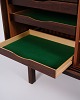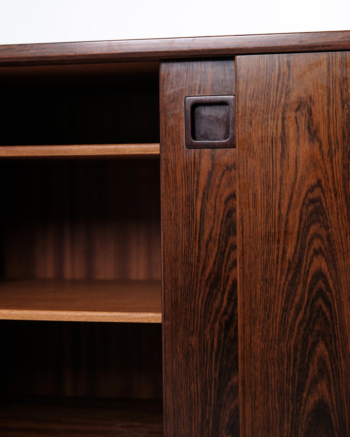 Skænken har to skydelåger med indfræsede greb i massivt palisander. Indvendigt findes fire udtræksskuffer samt hylder, som giver gode opbevaringsmuligheder og gør møblet velegnet til både stue og spisestue.
