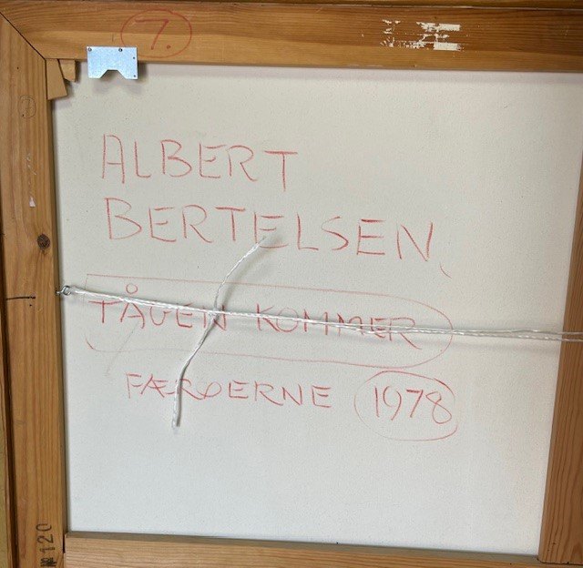 "Tågen kommer" Færøerne. Et af kunstnerens bedste oliemalerier fra Færøerne. Maleriet har været udstillet på Vejle Kunstmuseum.