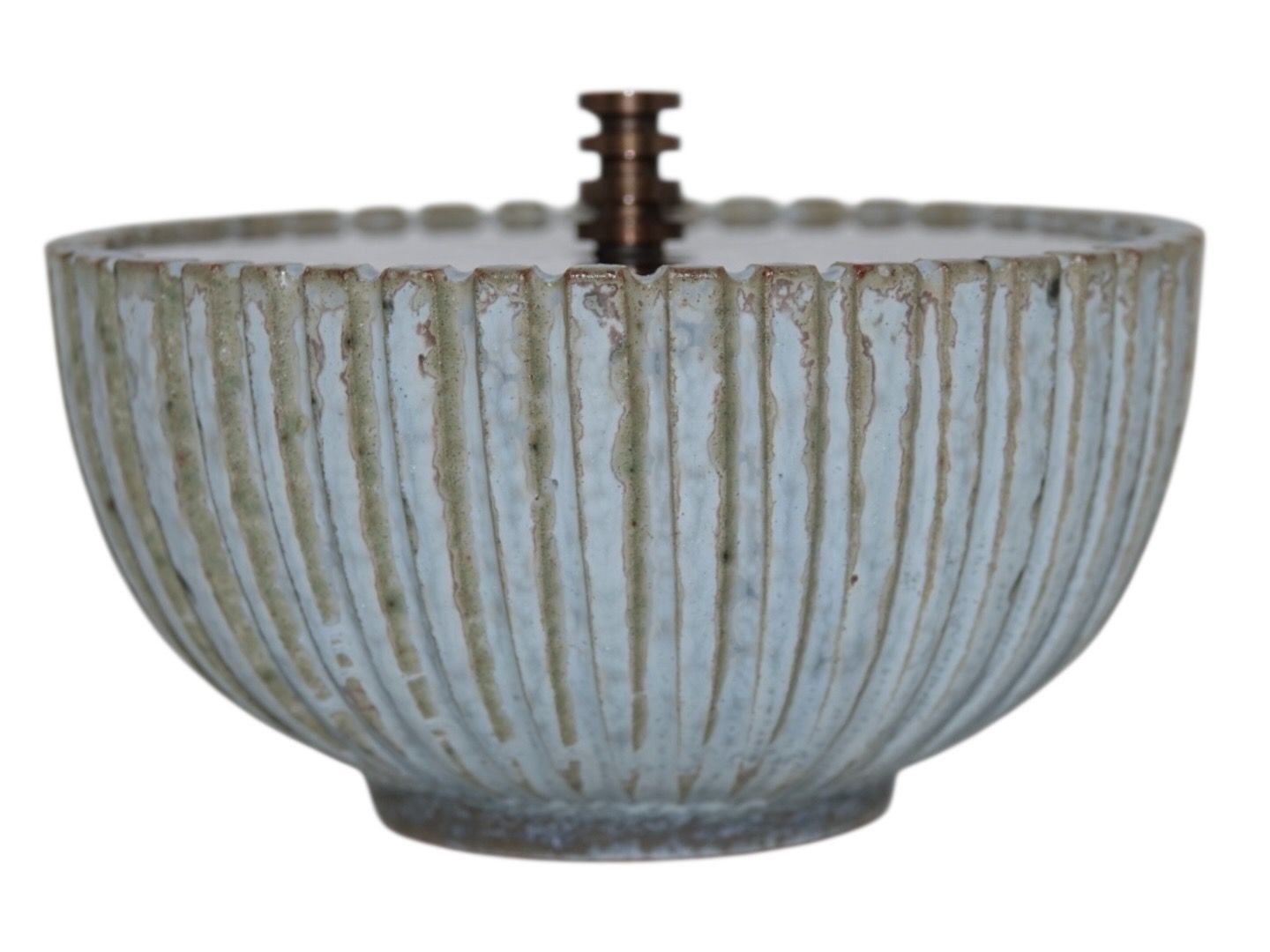 Beskrivelse: Arne Bang keramik, skål med en flot lyseblå glasur samt originalt bronzelåg.