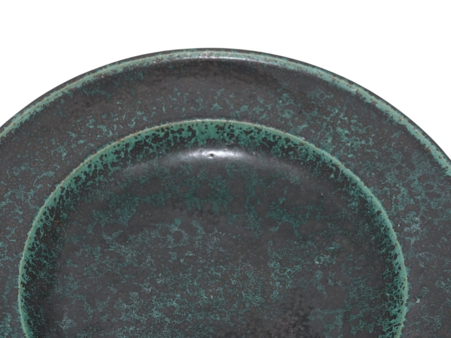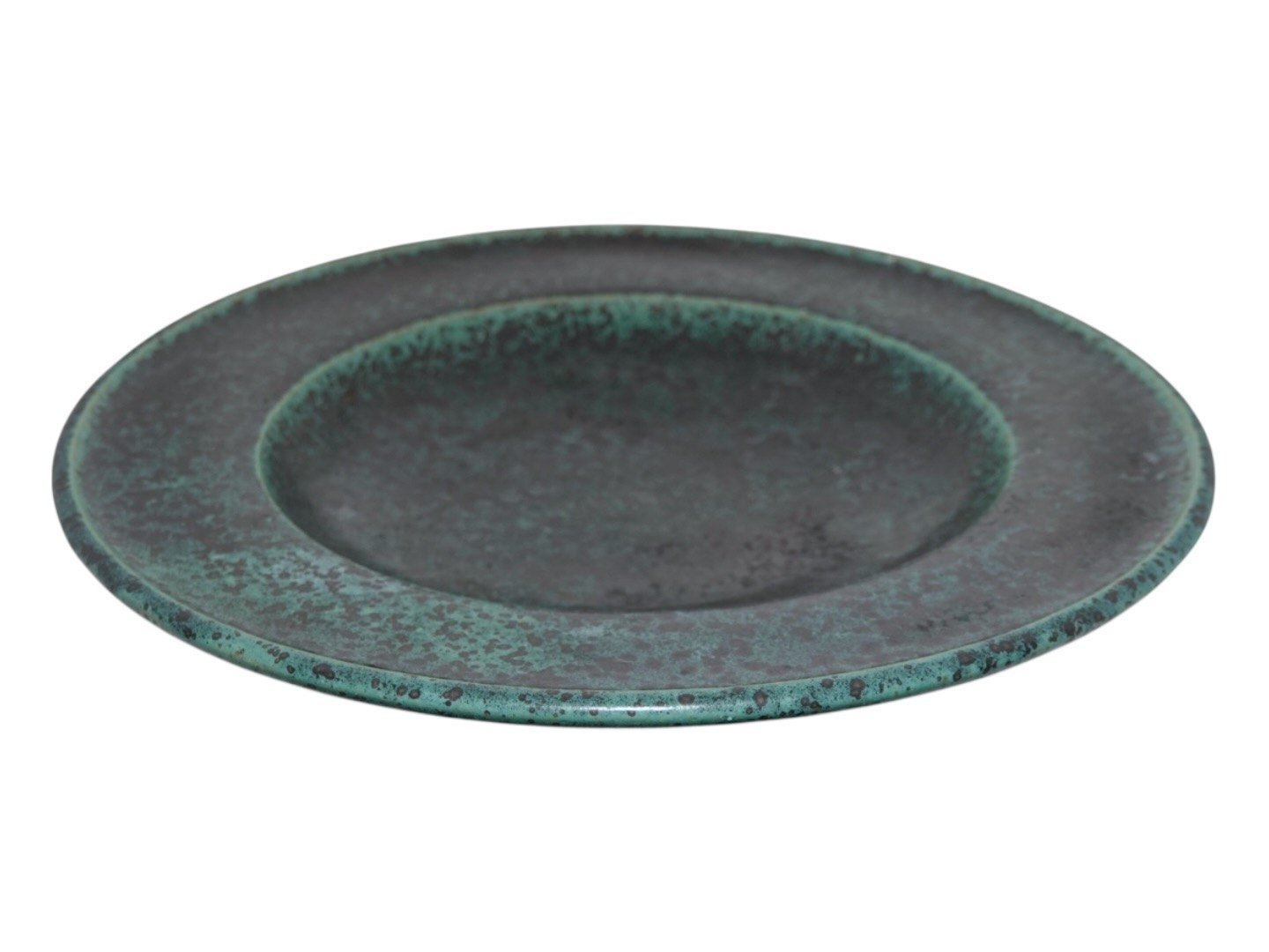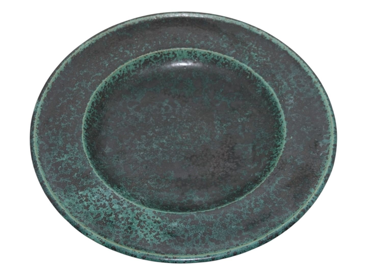 Beskrivelse: Arne Bang keramik, stort rundt fad med en mørkegrøn glasur.