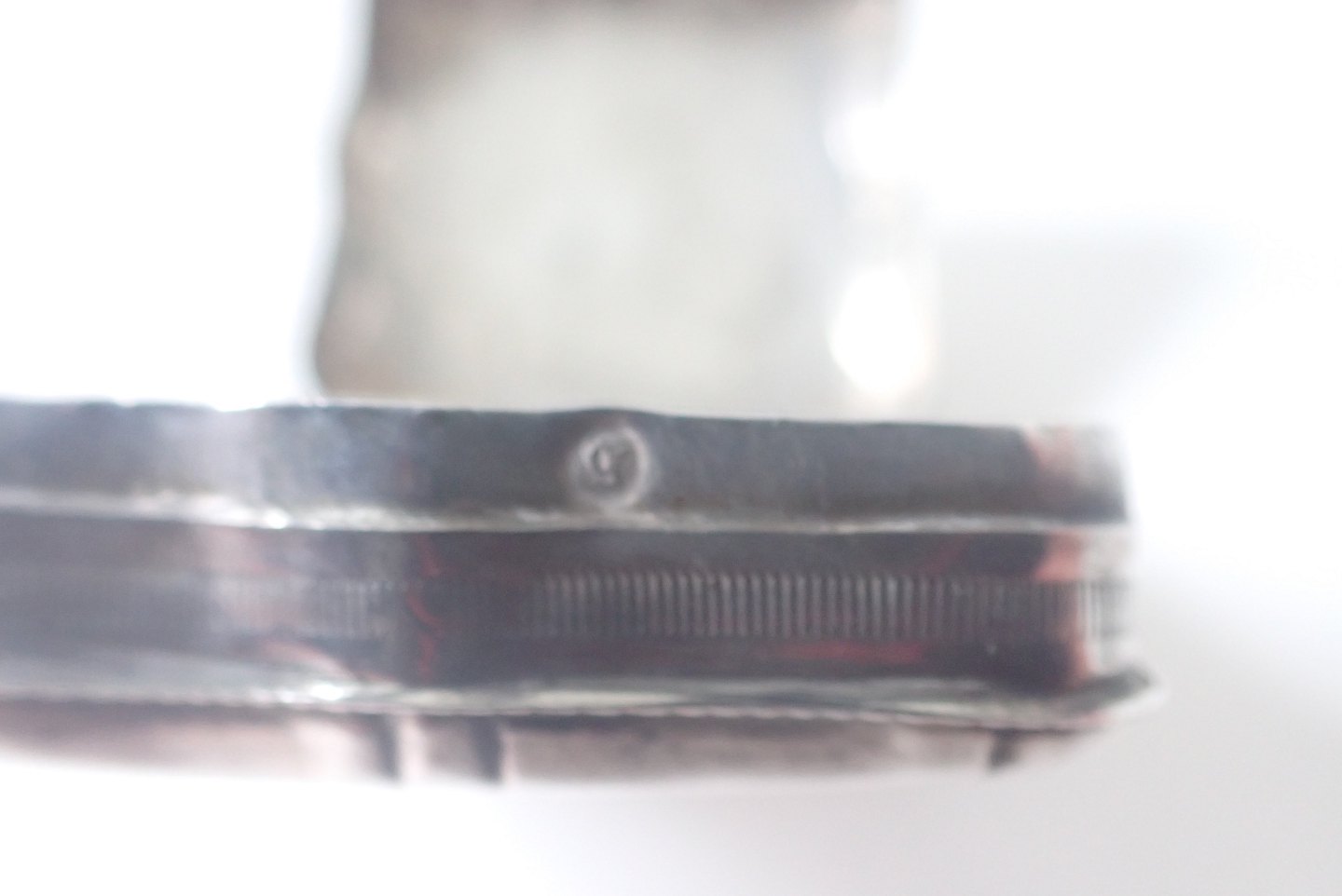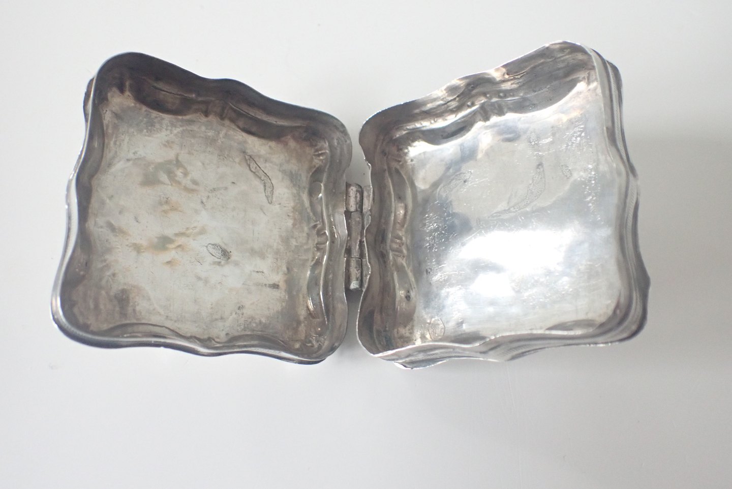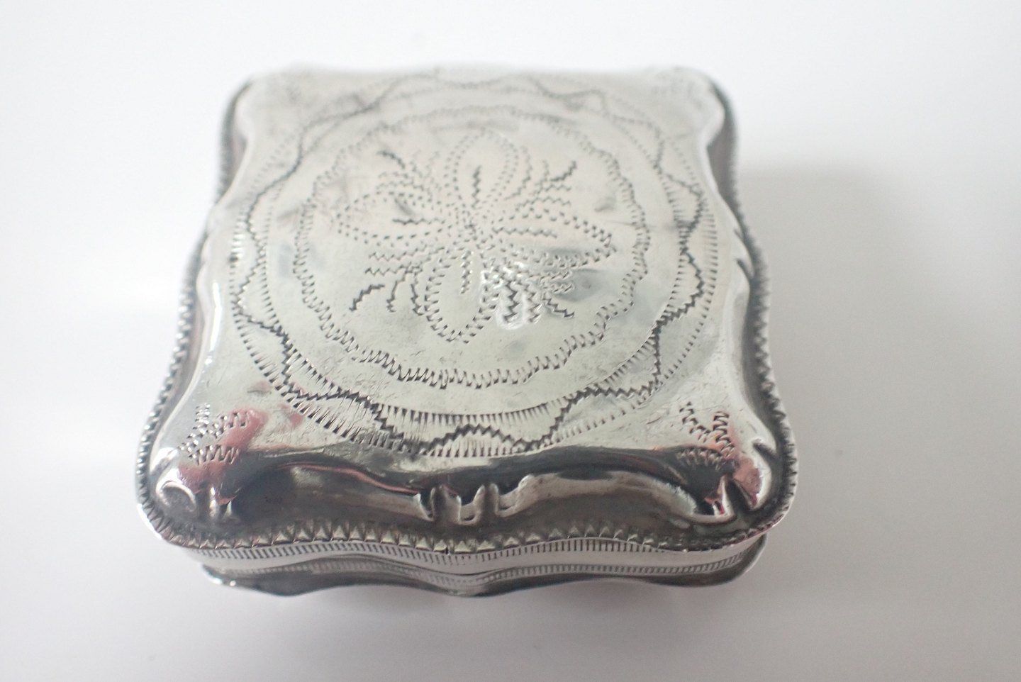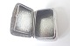 Beskrivelse: Æske bagerst: Firkantet pilleæske/tabatiere i tysk sølv med punslet dekorationer på forside, bagside og kanter. Tidlig 1800-tal. Vægt: 20,3 gram. Højde: 2,1 cm. bredde: 4,5 cm. I fin stand i forhold til alder. Pris: 600 kr.