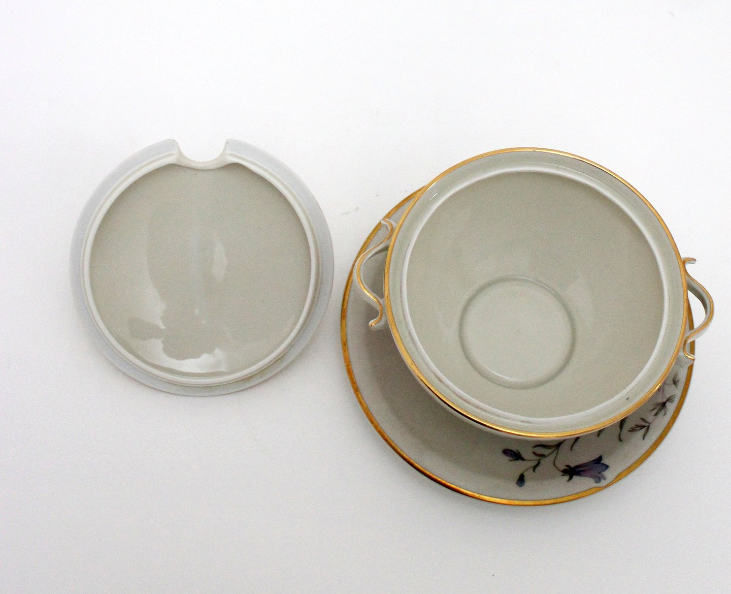 Boullionkop med låg og undertallerken. Længde 14 cm. Diameter 11,5 cm. Højde 9,5 cm. Undertallerken 14,5 cm. Sjælden. Pris: 200 kr. stk. Lager: 1