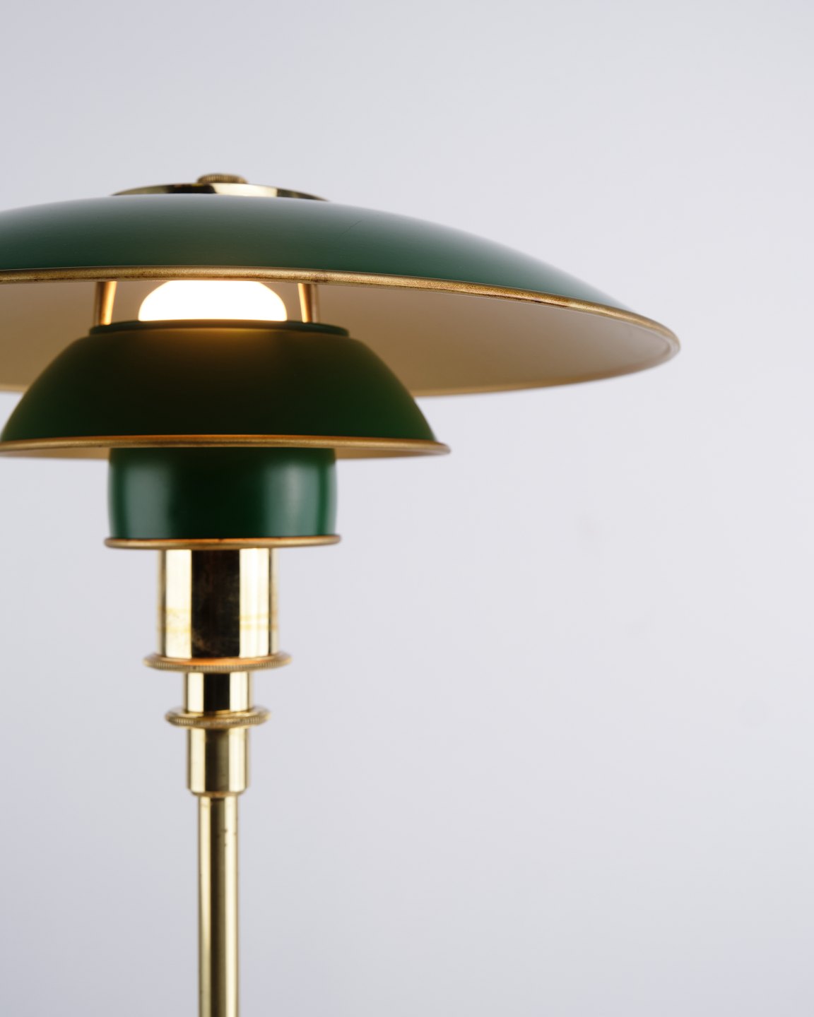 Poul Henningsen Bordlampe Model PH 3/2 Jubilæumsudgave i messing med grønne metalskærme for Louis Poulsen