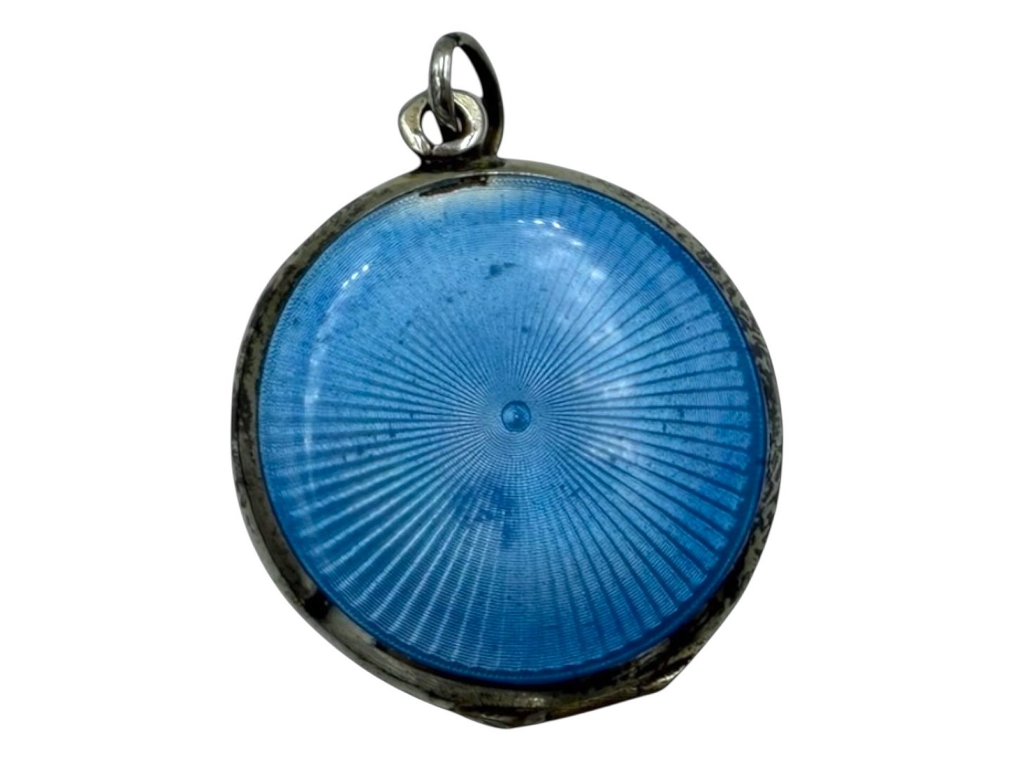 Beskrivelse: Lille sølv medaljon med lyseblå emalje og indvendig forgyldt.