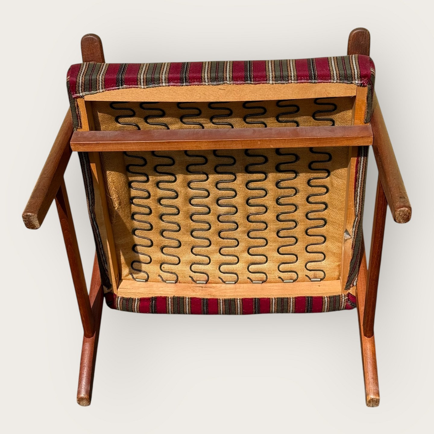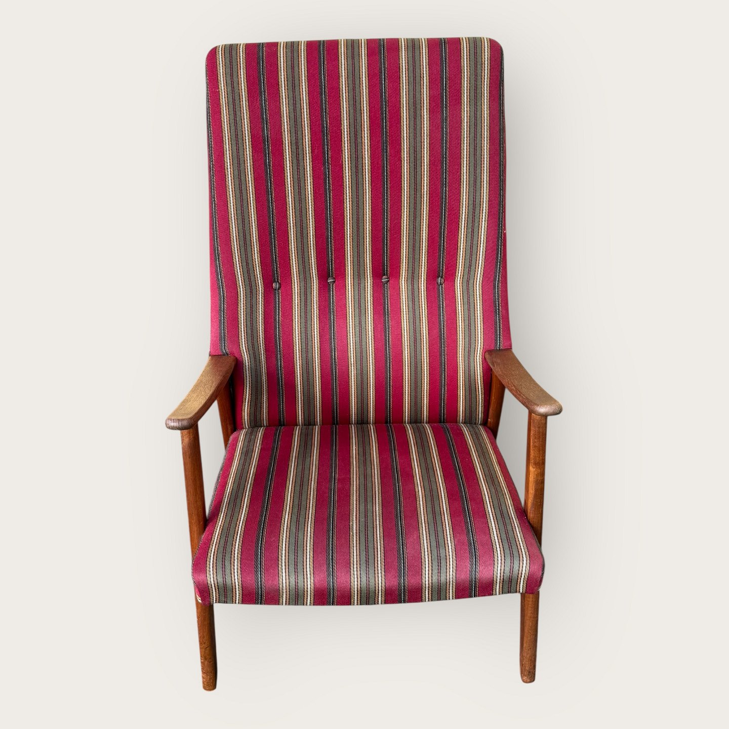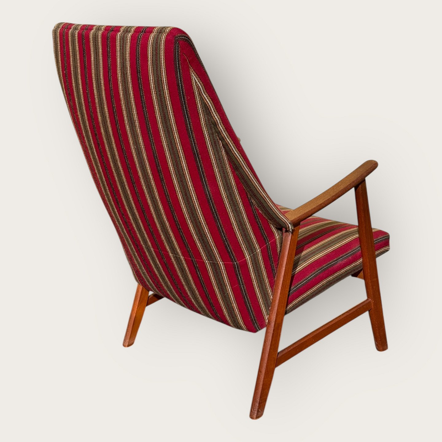 Beskrivelse: Lænestol i teaktræ og stof, sædehøjde 36cm, bredde 62cm, ryglæn højde 103cm, scandinavian modern fra 1960'erne *pæn stand*