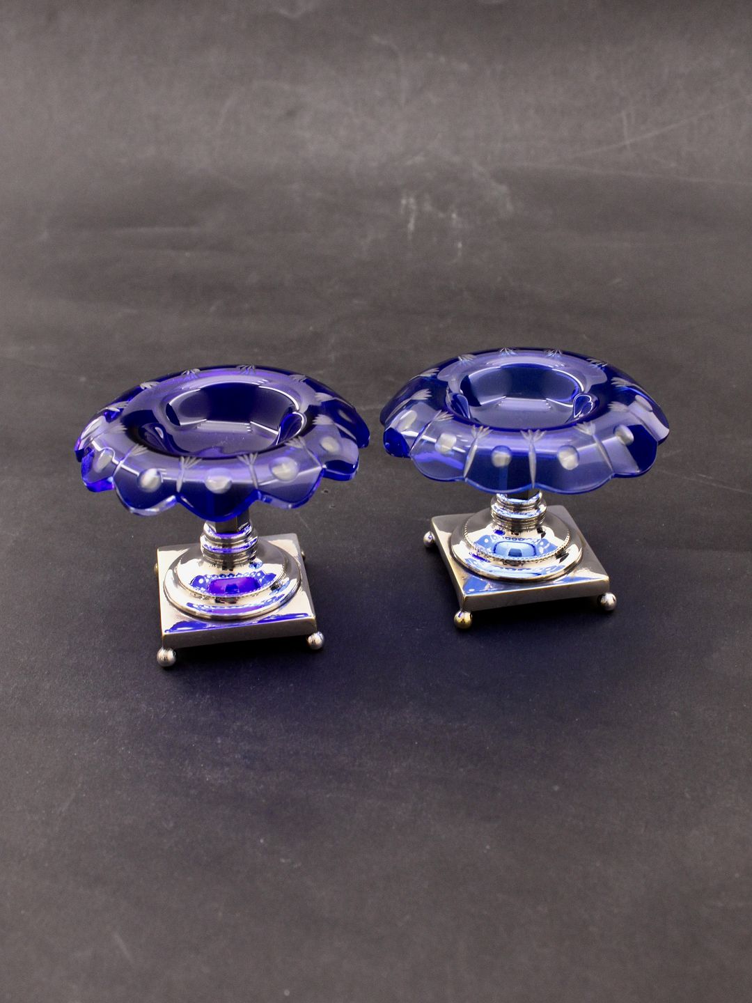 : Et par saltkar i blåt glas med forsølvet fod D. 10 cm. emne nr. 634269