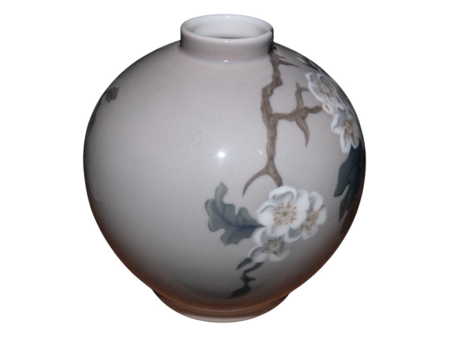 Beskrivelse: Bing & Grøndahl kuglerund vase med hvide blomstergrene og sommerfugl.